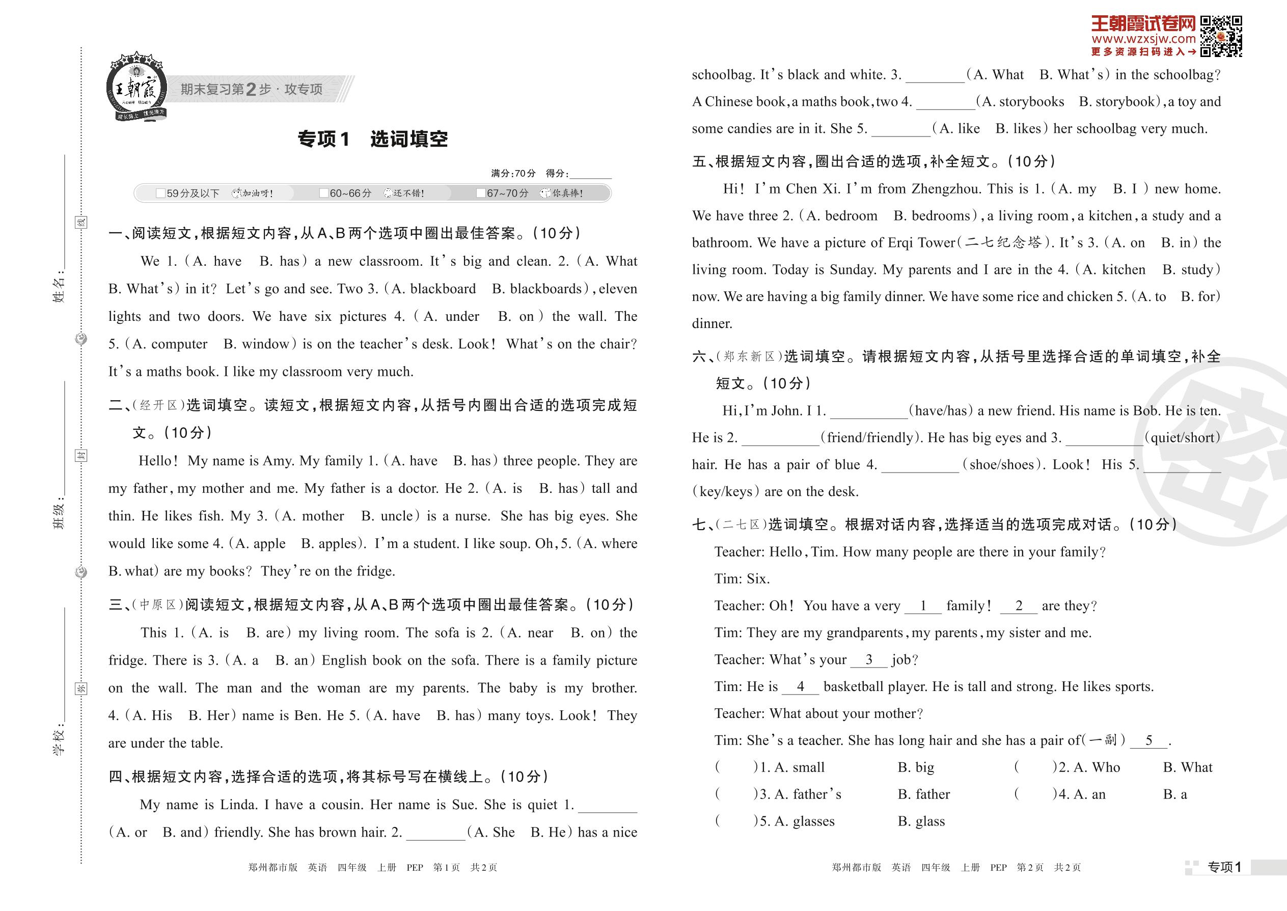 王朝霞期末专项卷——选词填空四年级上册英语(PEP版)【1】