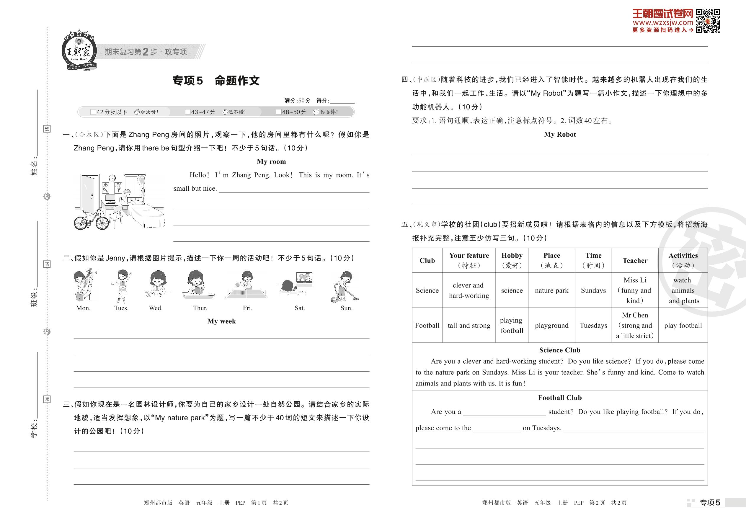 王朝霞期末专项卷——命题作文五年级上册英语(PEP版)【5】