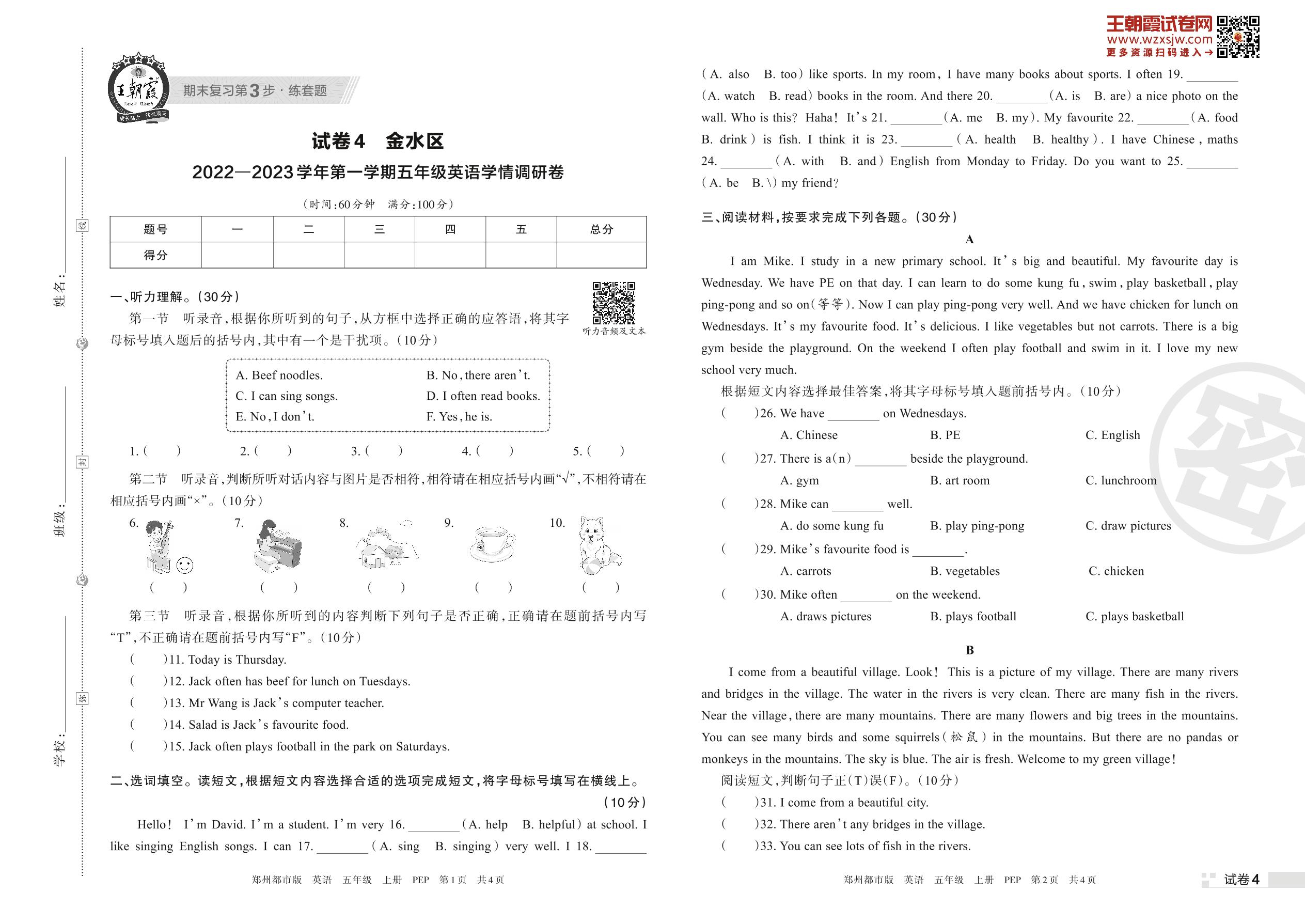 金水区2022—2023学年第一学期五年级英语学情调研卷(PEP版)【4】