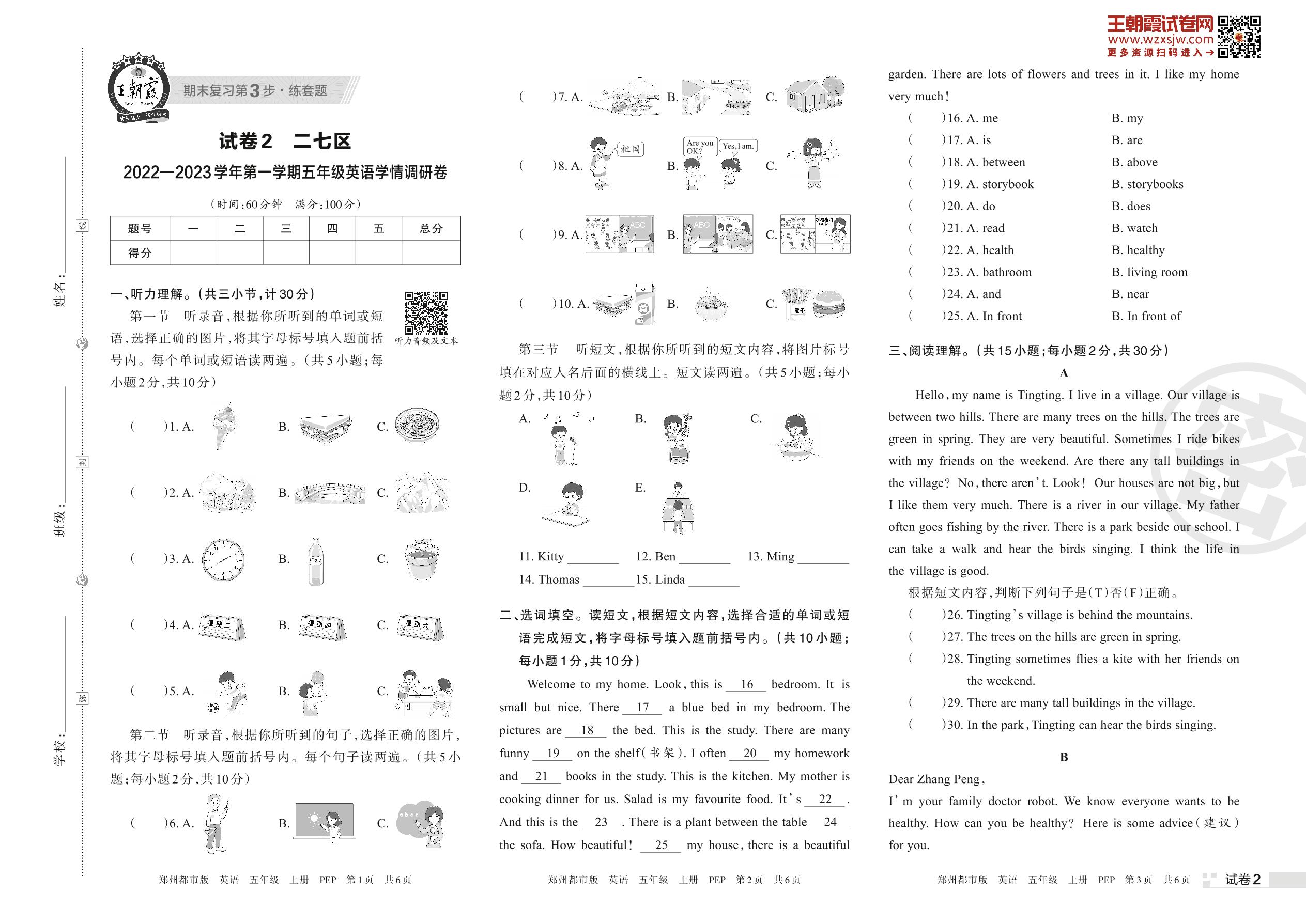 二七区2022—2023学年第一学期五年级英语学情调研卷(PEP版)【2】