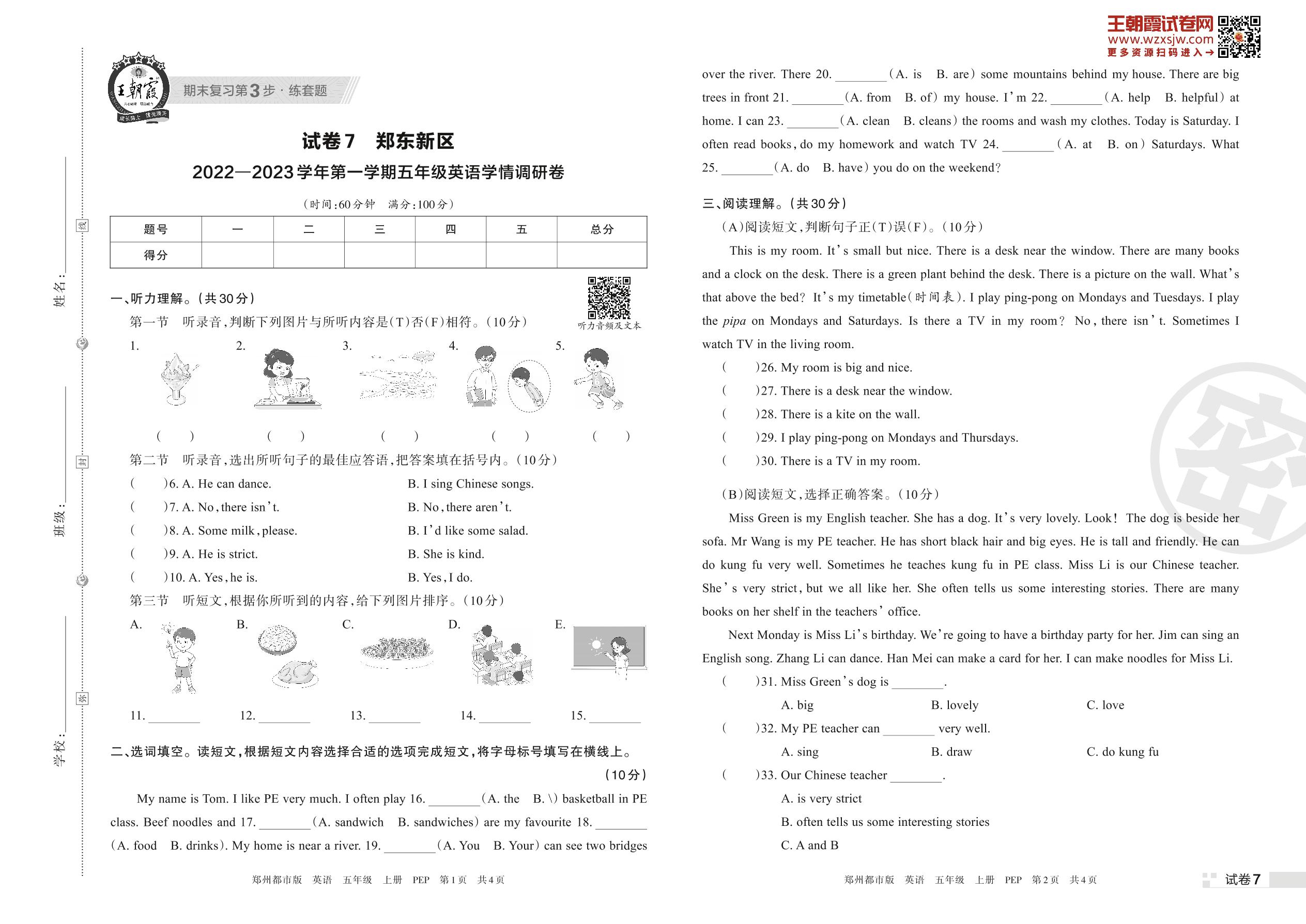 郑东新区2022—2023学年第一学期五年级英语学情调研卷(PEP版)【7】