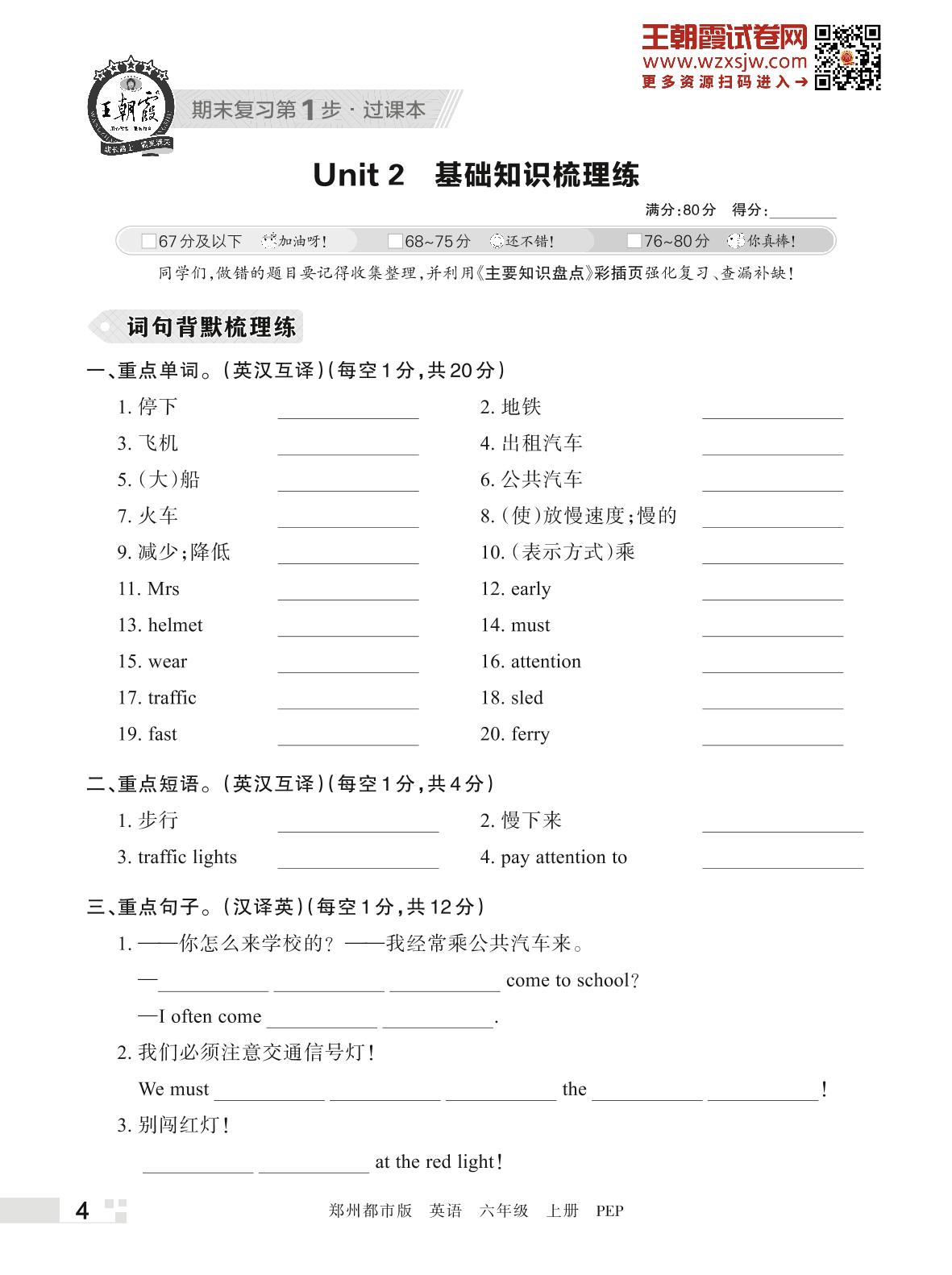 王朝霞期末过课本——Unit 2 基础知识梳理练六年级上册英语(PEP版)_R221112153833925