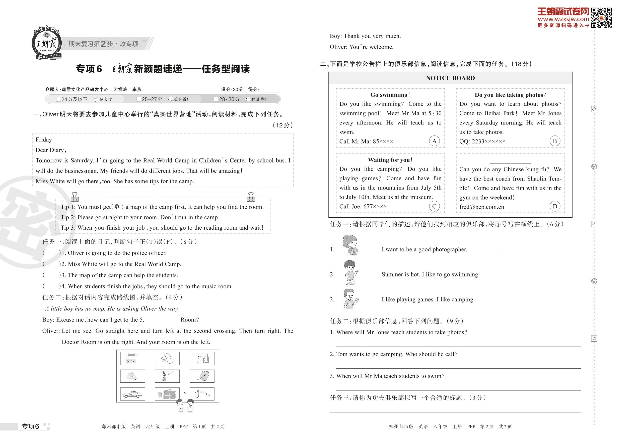 王朝霞期末专项卷——王朝霞新颖题速递:任务型阅读六年级上册英语(PEP版)_R221112153834571【6】