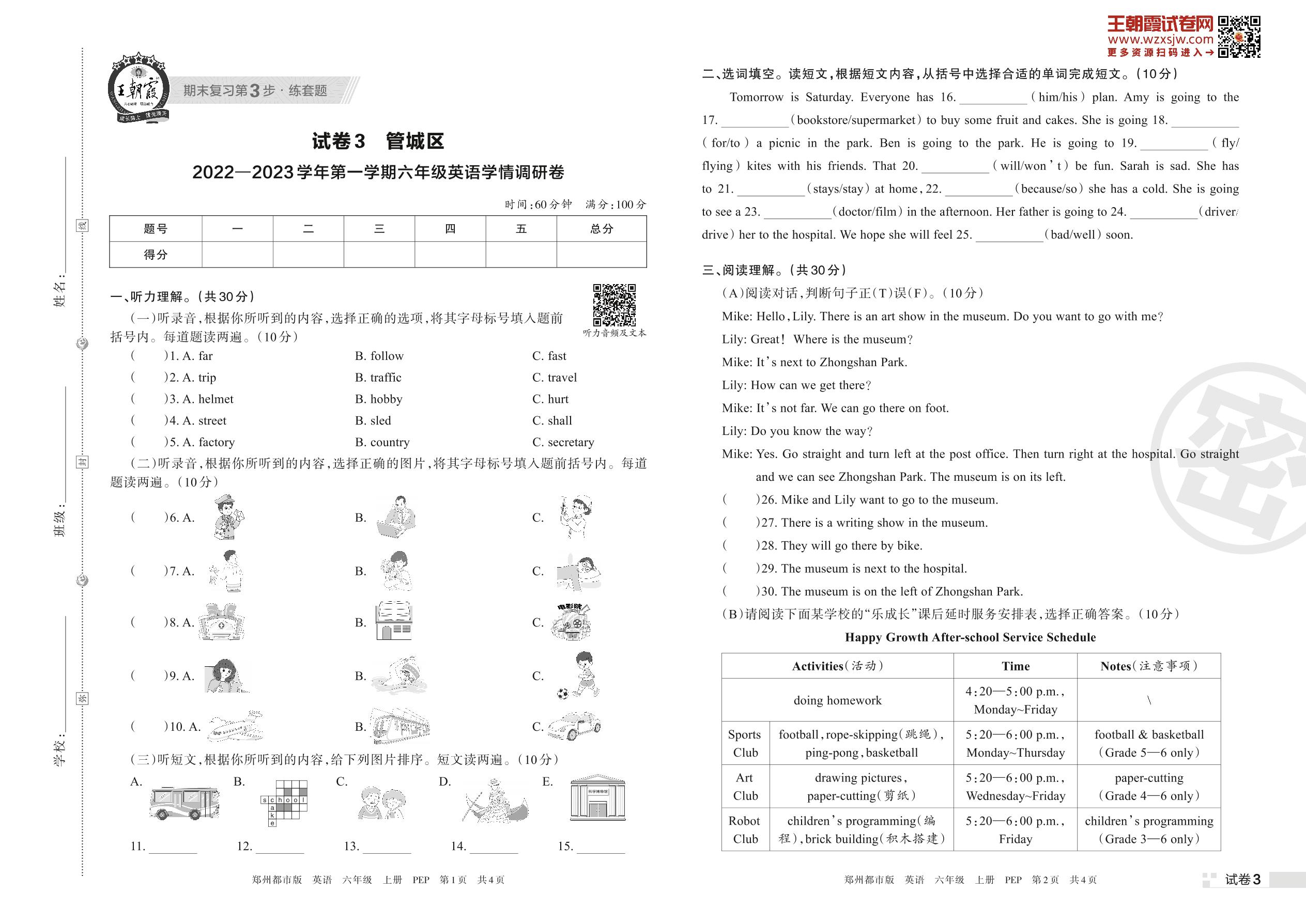 管城区2022—2023学年第一学期六年级英语学情调研卷(PEP版)【3】