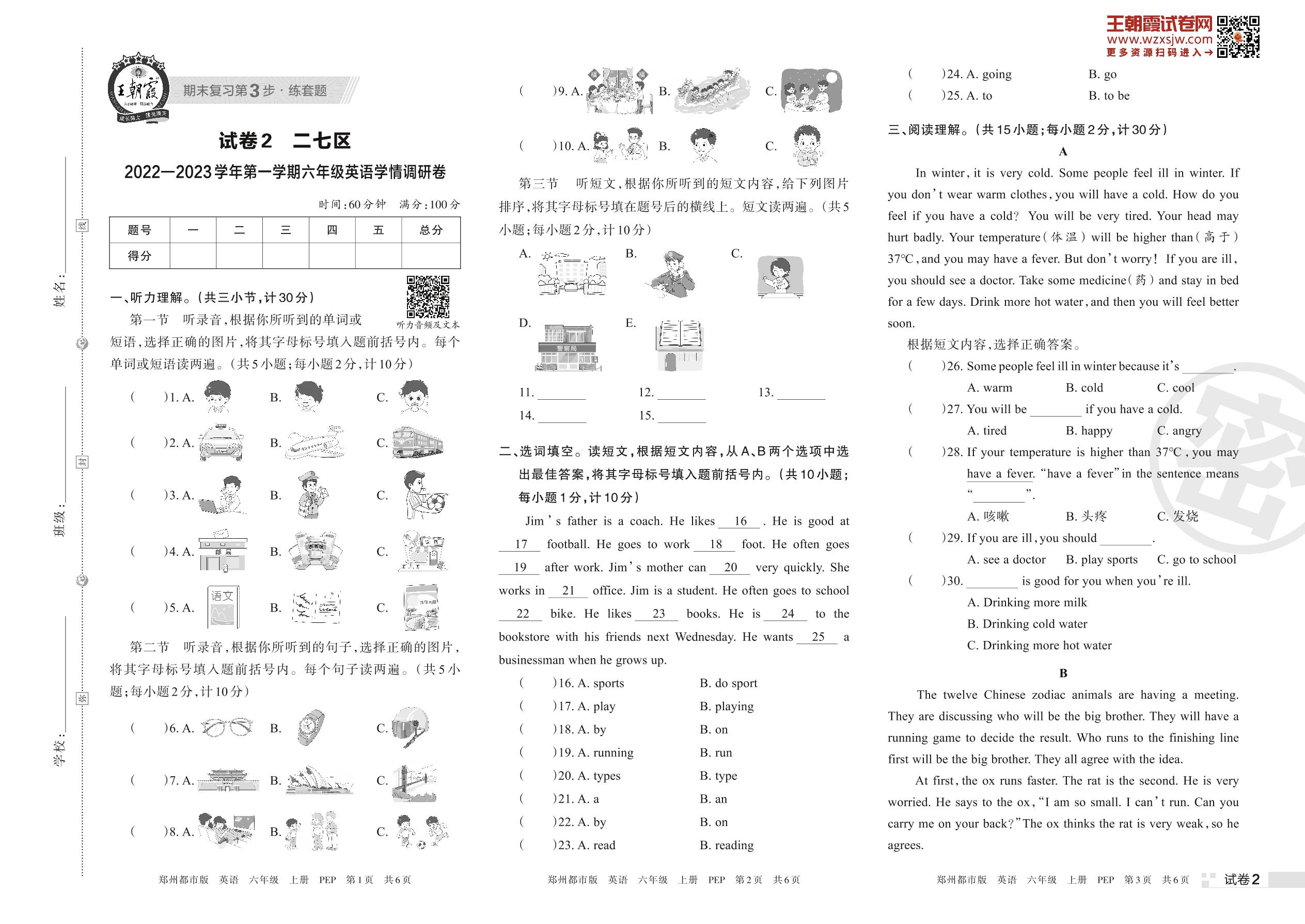 二七区2022—2023学年第一学期六年级英语学情调研卷(PEP版)【2】