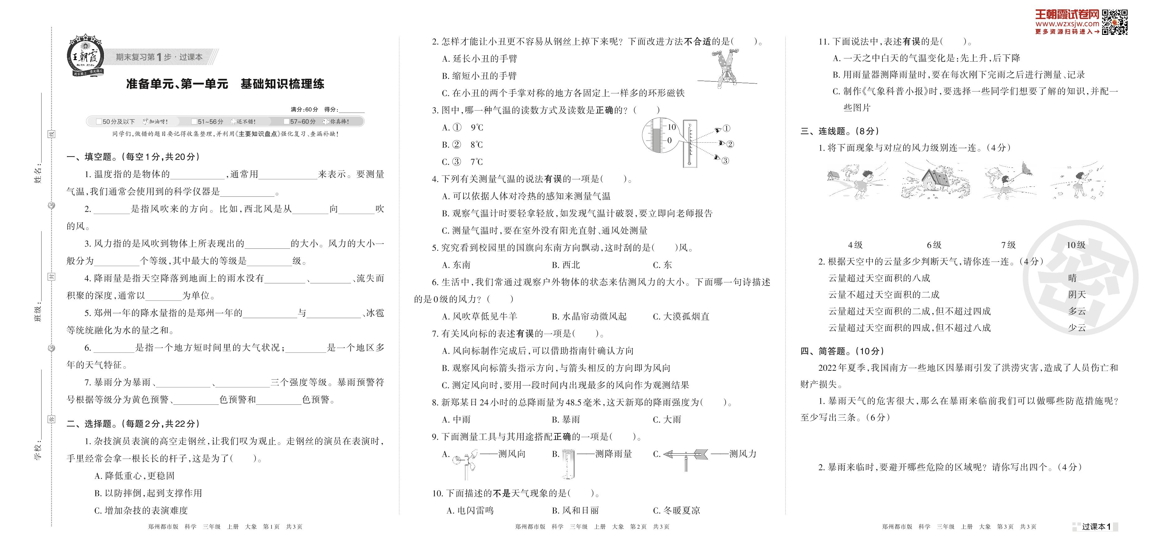 王朝霞期末过课本——准备单元、第一单元 基础知识梳理练三年级上册科学(大象版)