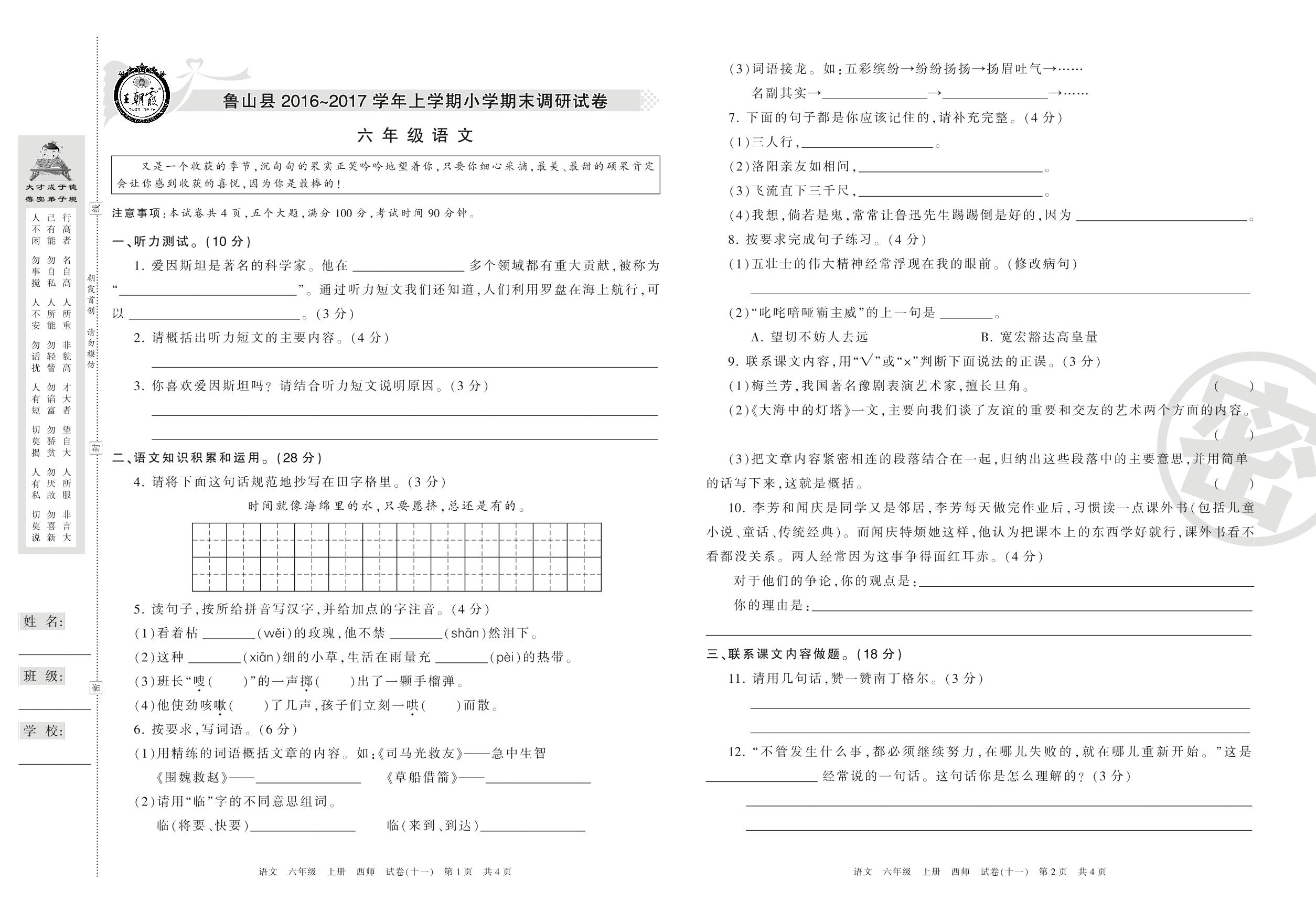 2016-2017学年第一学期平顶山市鲁山县六年级语文试卷(西师版)【11】