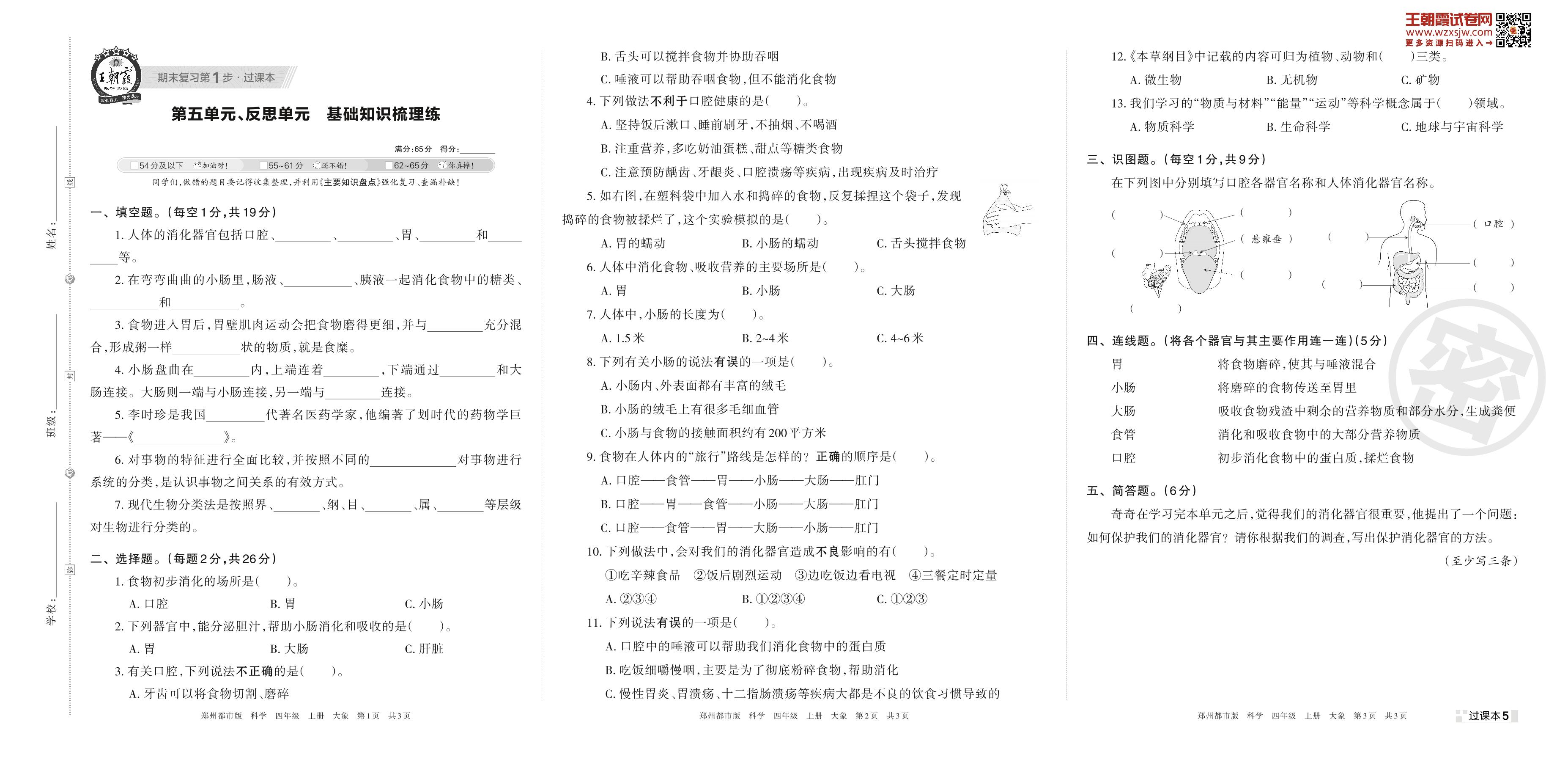 王朝霞期末过课本——第五单元、反思单元 基础知识梳理练四年级上册科学(大象版)