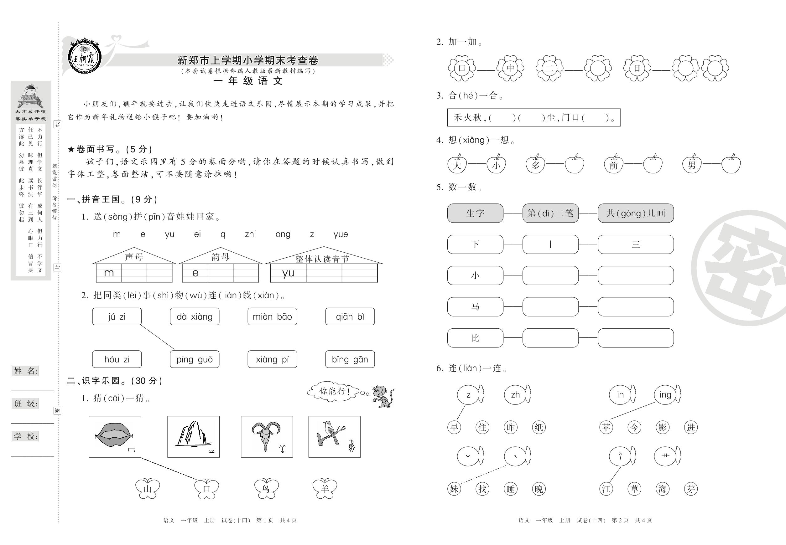 2016-2017学年第一学期新郑市一年级语文试卷(人教版)【14】