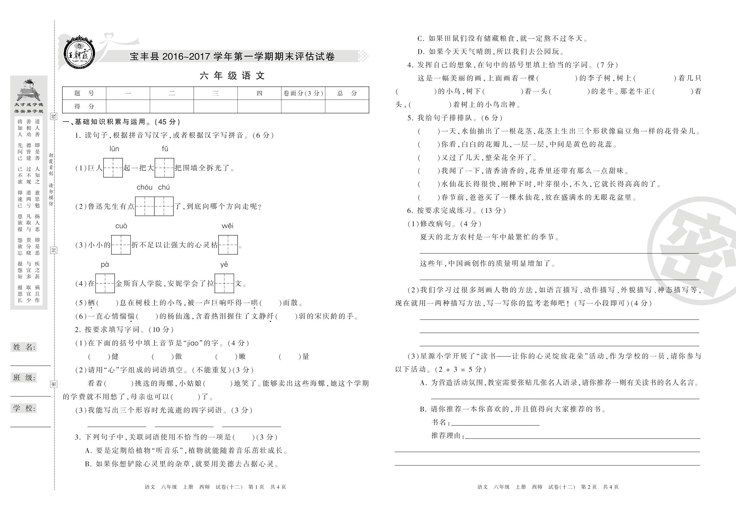 2016-2017学年第一学期平顶山市宝丰县六年级语文试卷(西师版)【12】