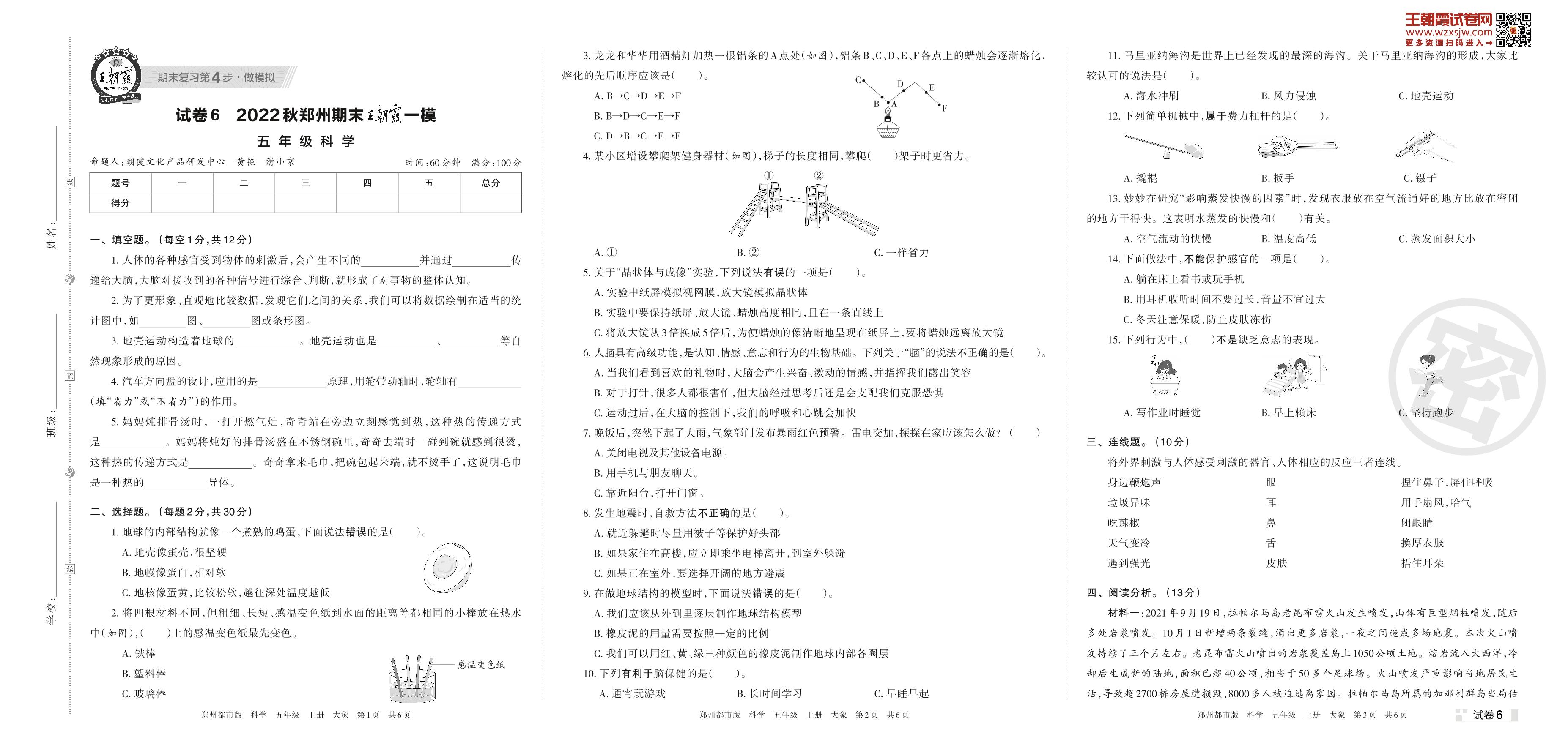 王朝霞期末模拟卷五年级上册科学(大象版)【6】