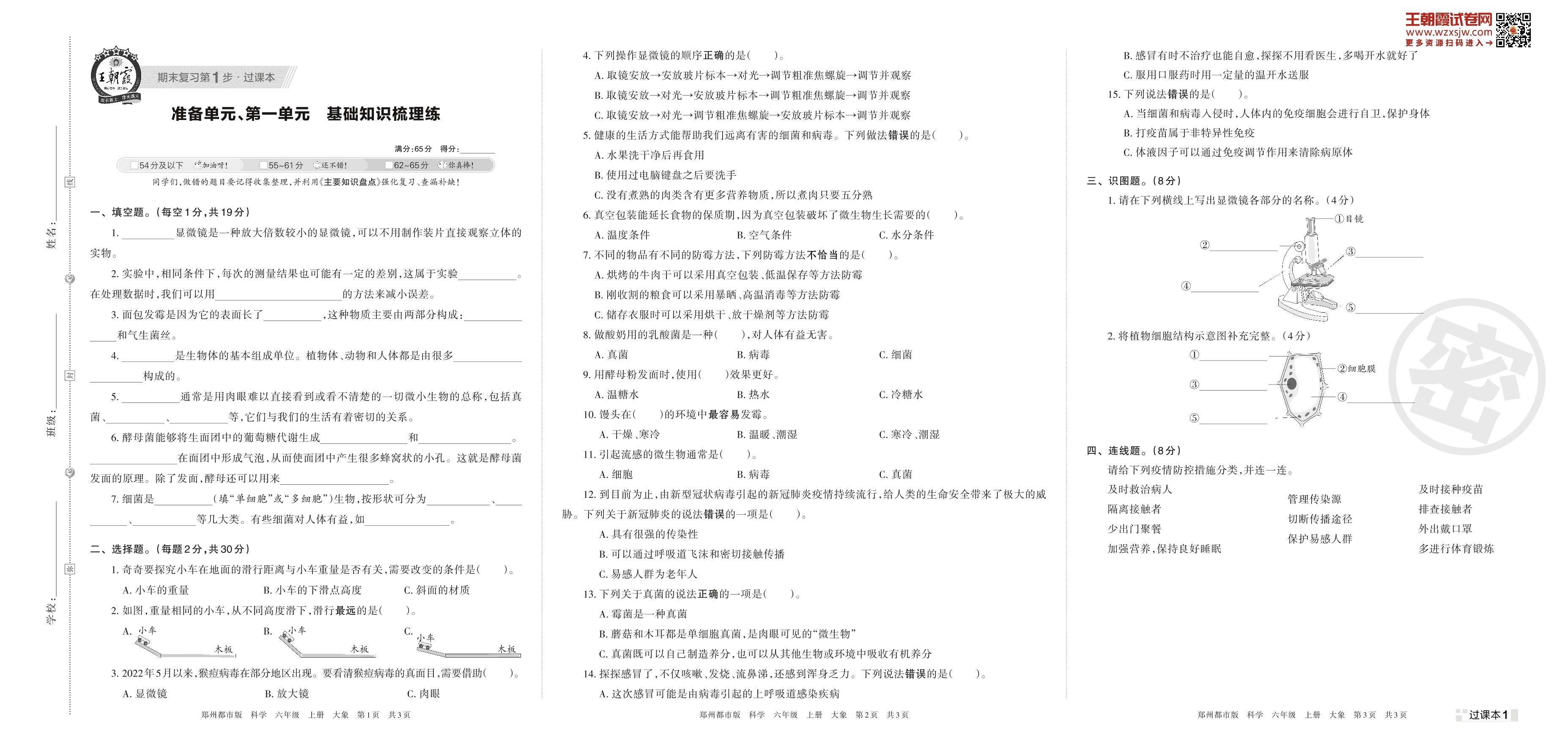 王朝霞期末过课本——准备单元、第一单元 基础知识梳理练六年级上册科学(大象版)