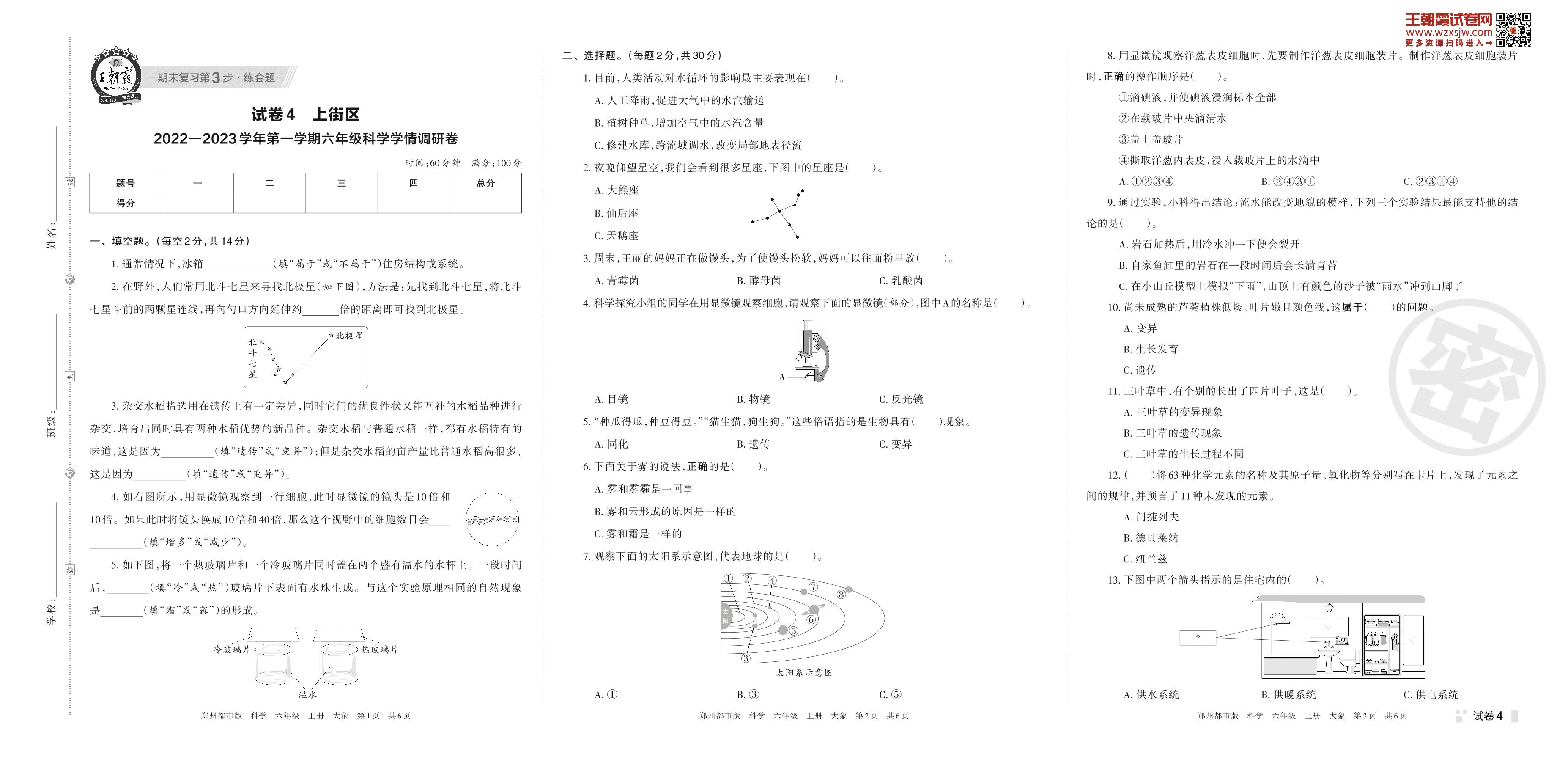 上街区2022—2023学年第一学期六年级科学学情调研卷(大象版)【4】