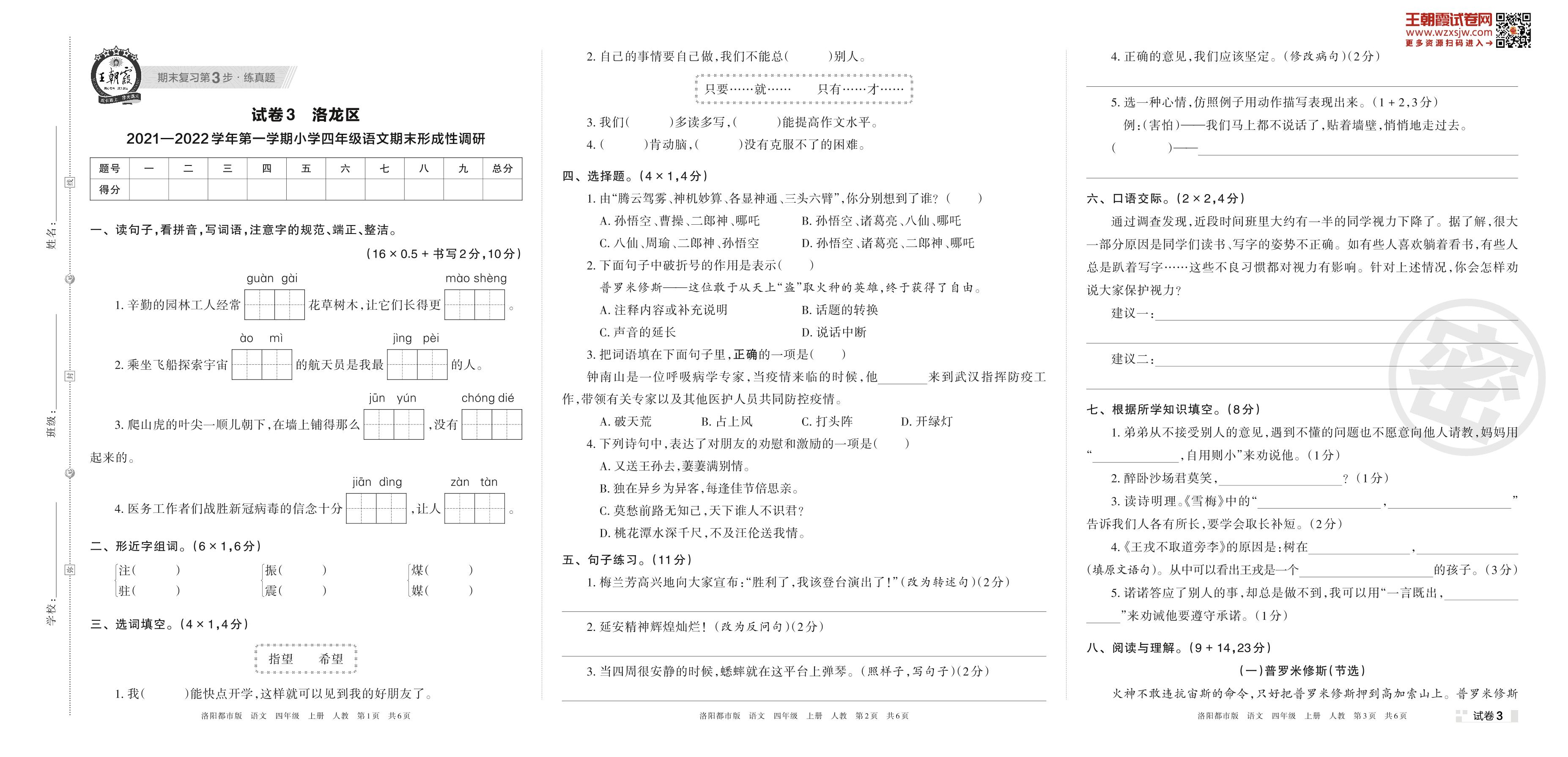 洛龙区2021—2022学年第一学期小学四年级语文期末形成性调研(人教版)【3】