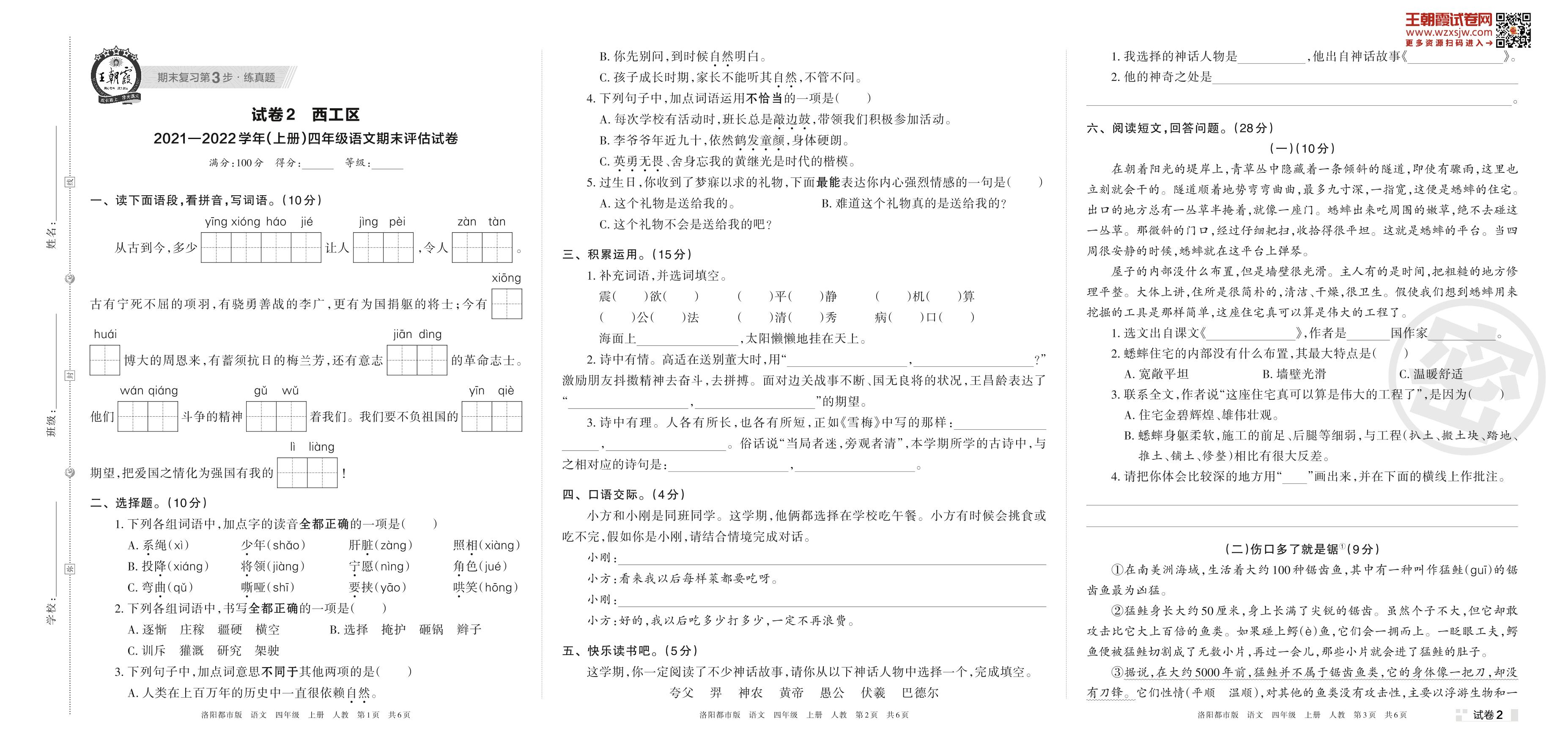 西工区2021—2022学年(上册)四年级语文期末评估试卷(人教版)【2】
