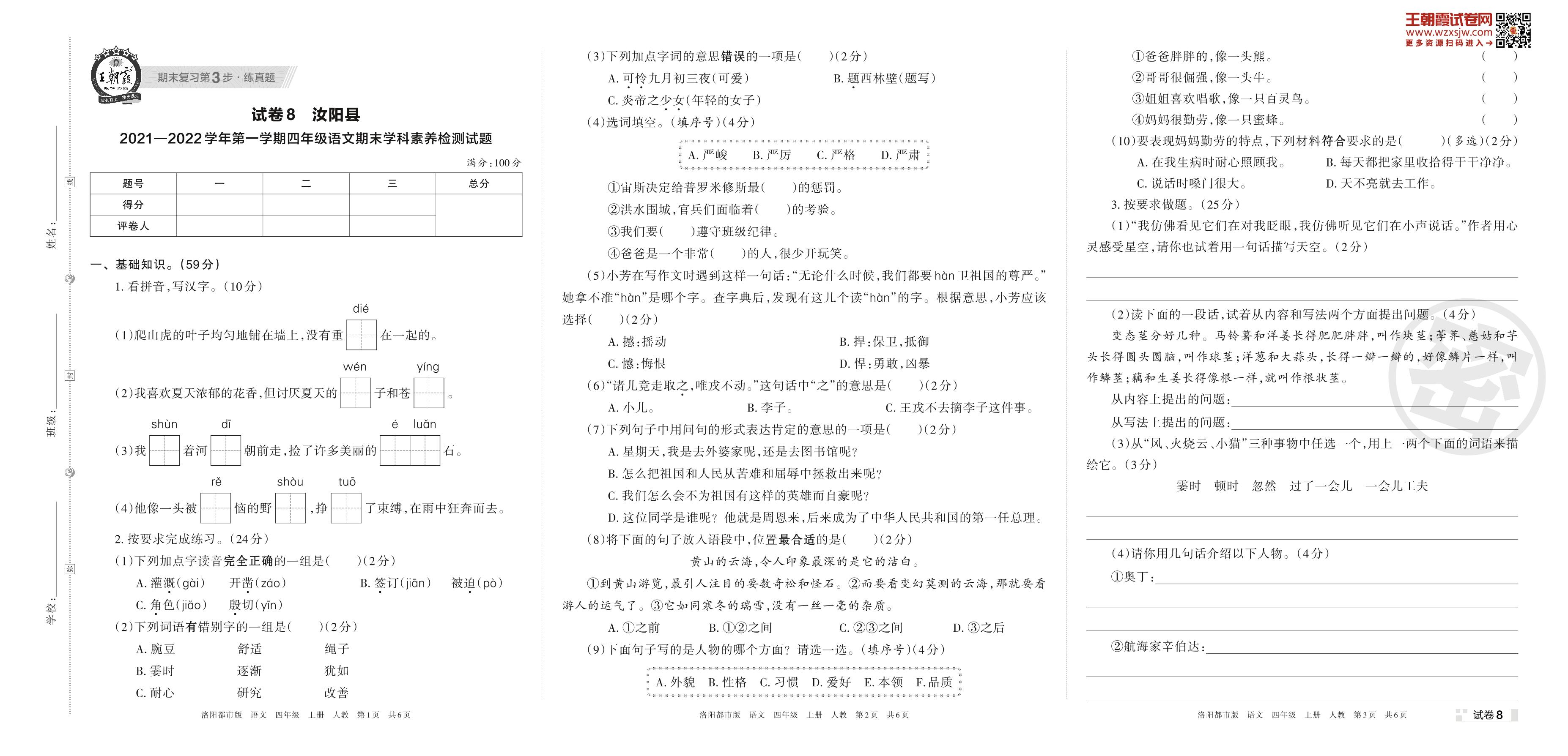 汝阳县2021—2022学年第一学期四年级语文期末学科素养检测试题(人教版)【8】