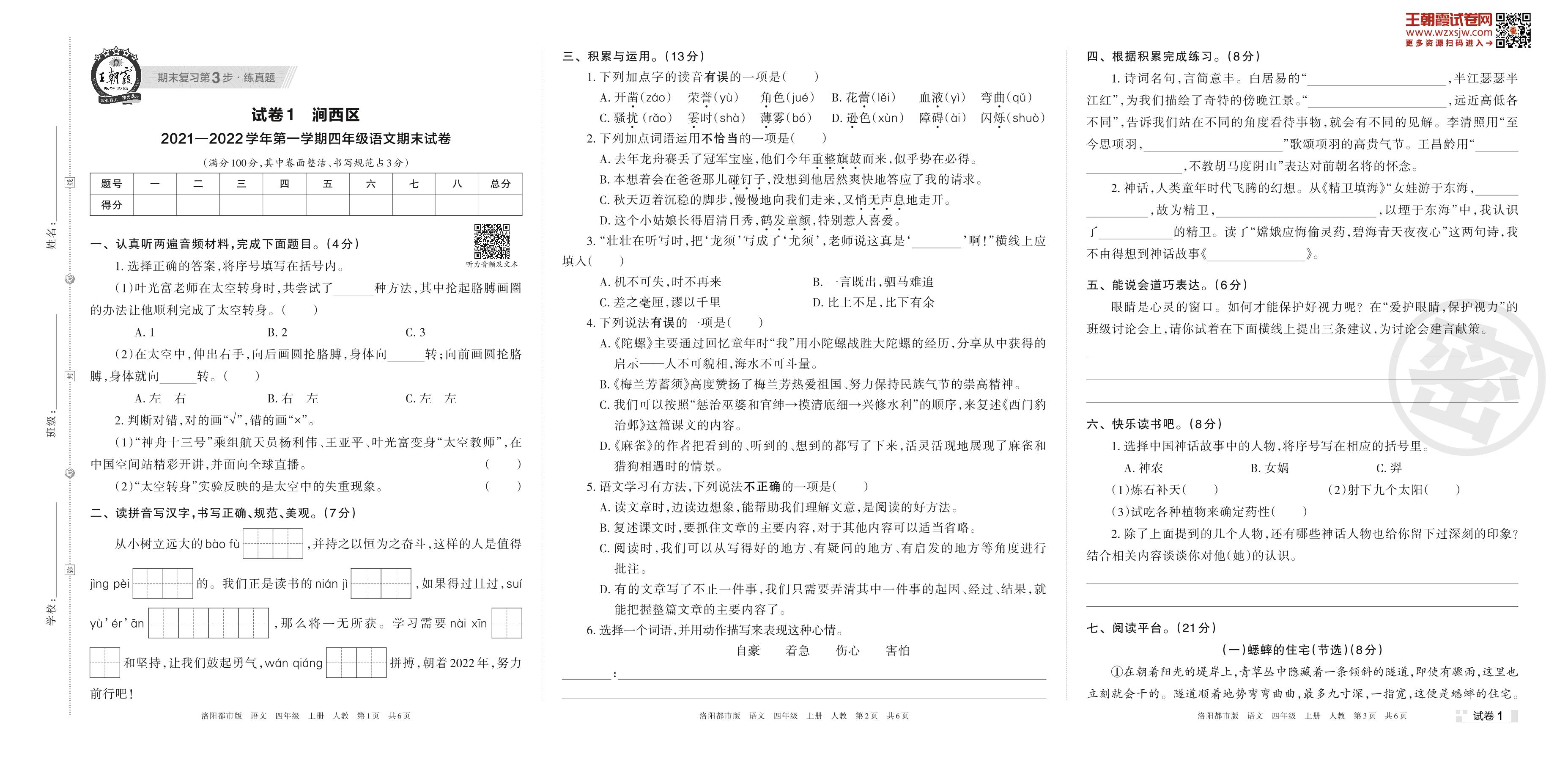 涧西区2021—2022学年第一学期四年级语文期末试卷(人教版)【1】