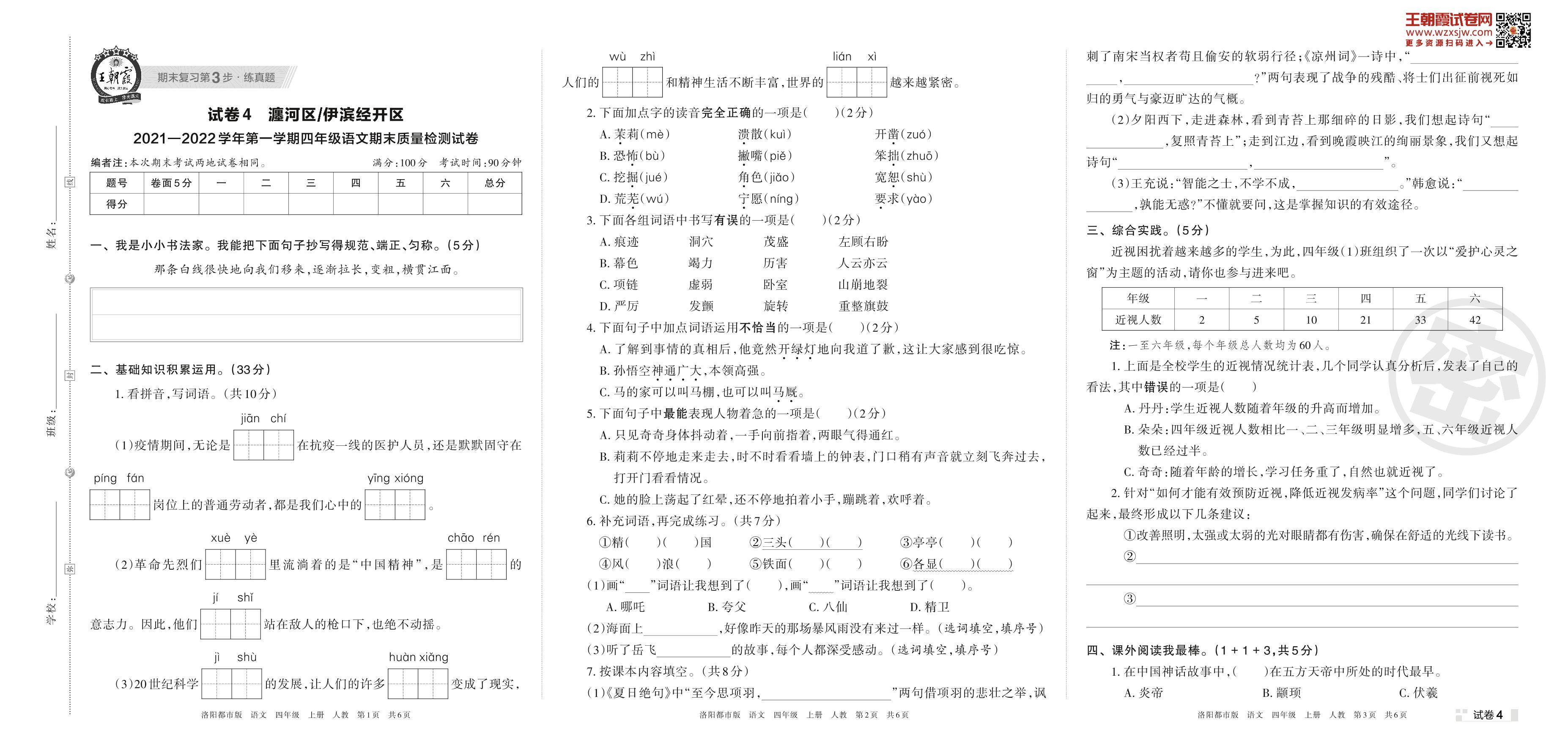 瀍河区、伊滨经开区2021—2022学年第一学期四年级语文期末质量检测试卷(人教版)【4】