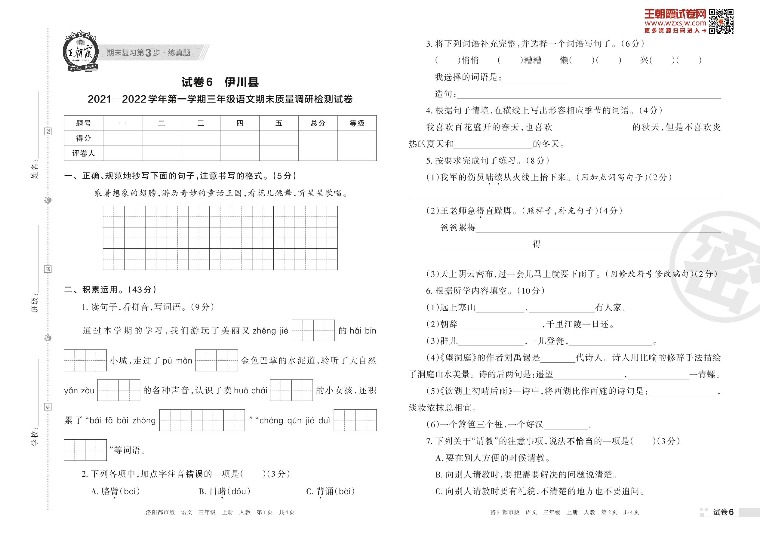 伊川县2021—2022学年第一学期三年级语文期末质量调研检测试卷(人教版)【6】