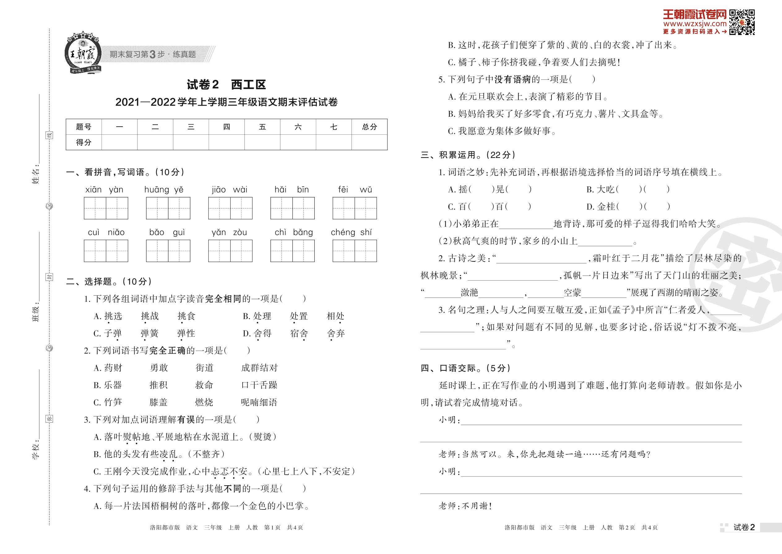 西工区2021—2022学年上学期三年级语文期末评估试卷(人教版)【2】