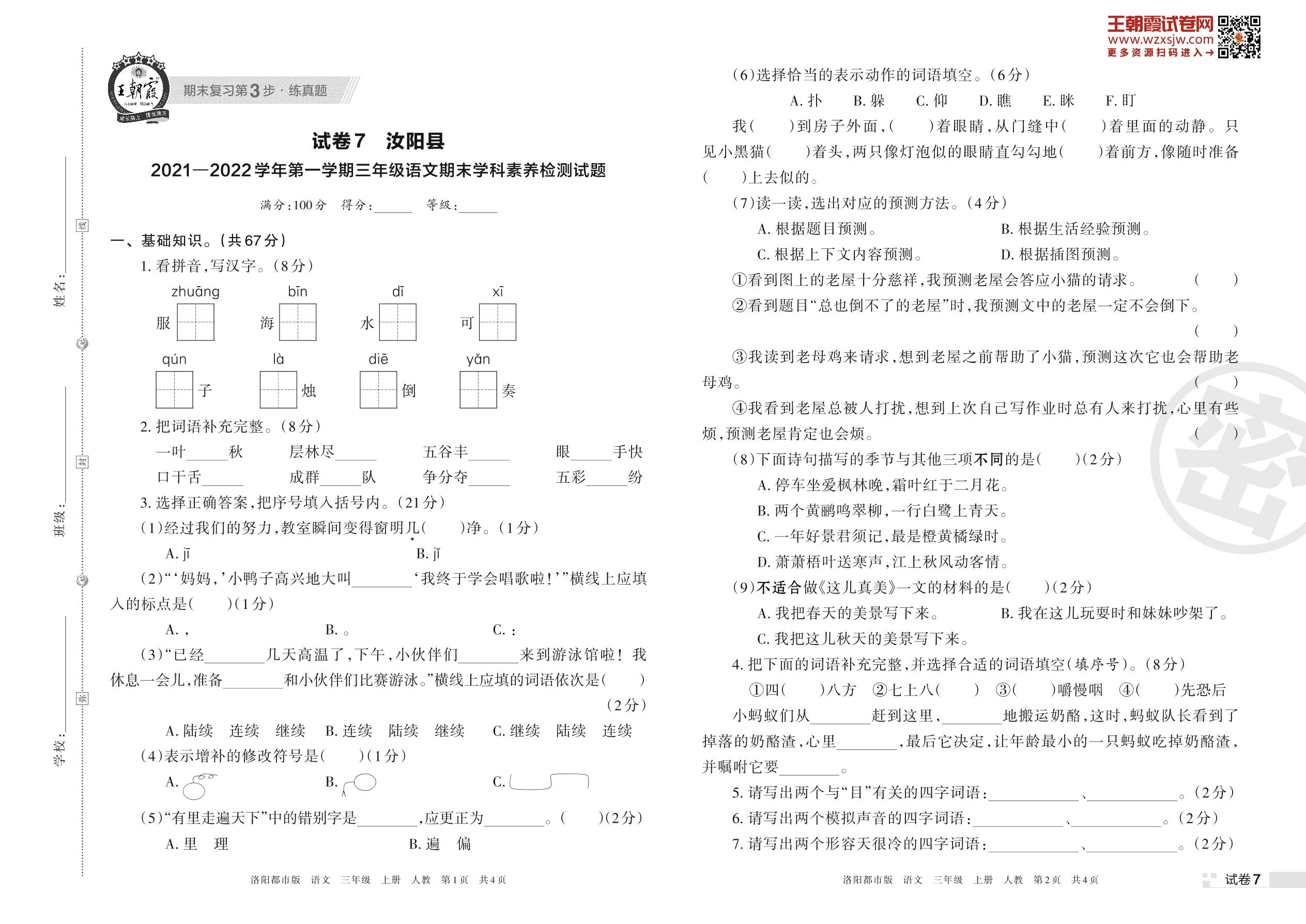 汝阳县2021—2022学年第一学期三年级语文期末学科素养检测试题(人教版)【7】