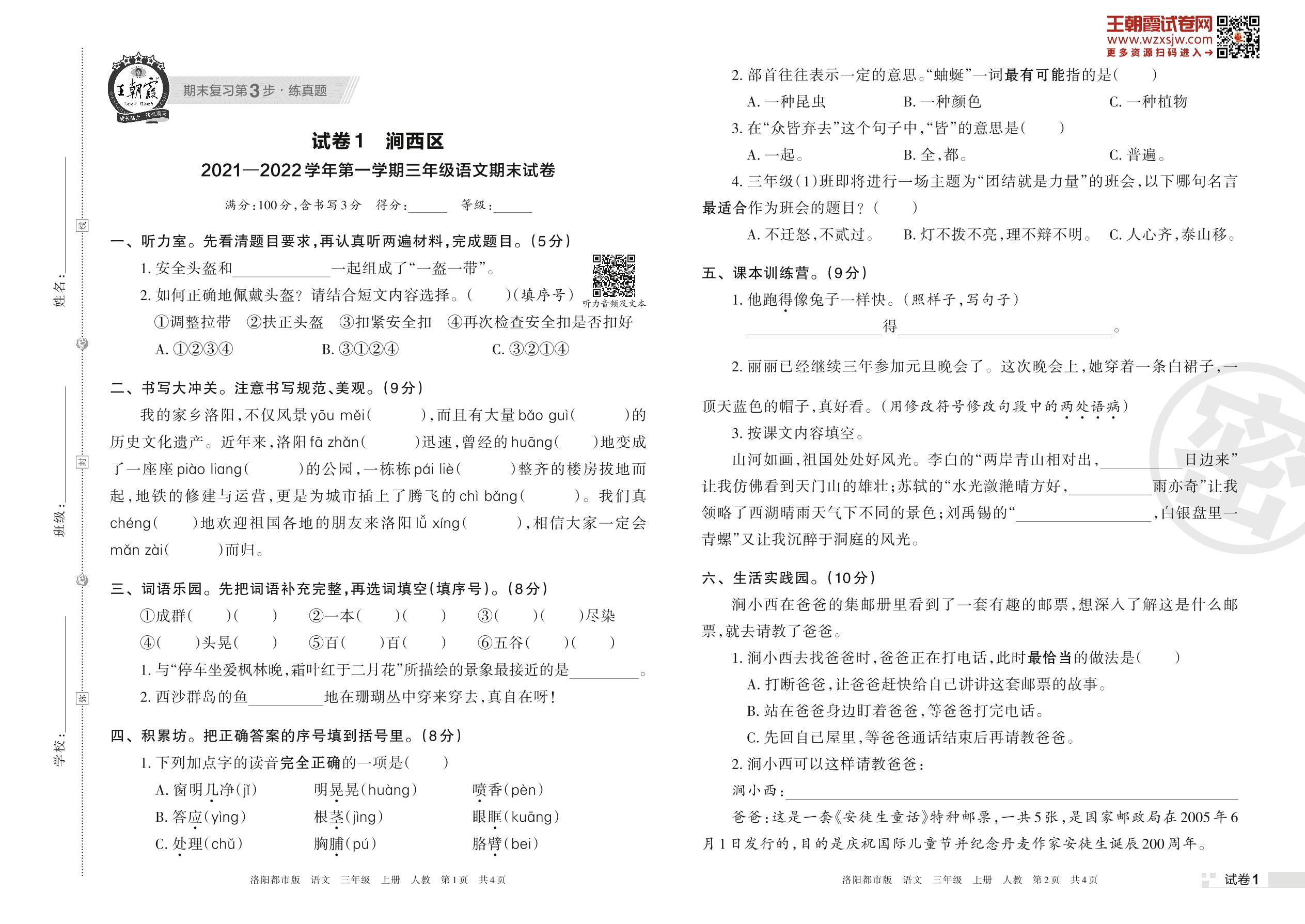 涧西区2021—2022学年第一学期三年级语文期末试卷(人教版)【1】