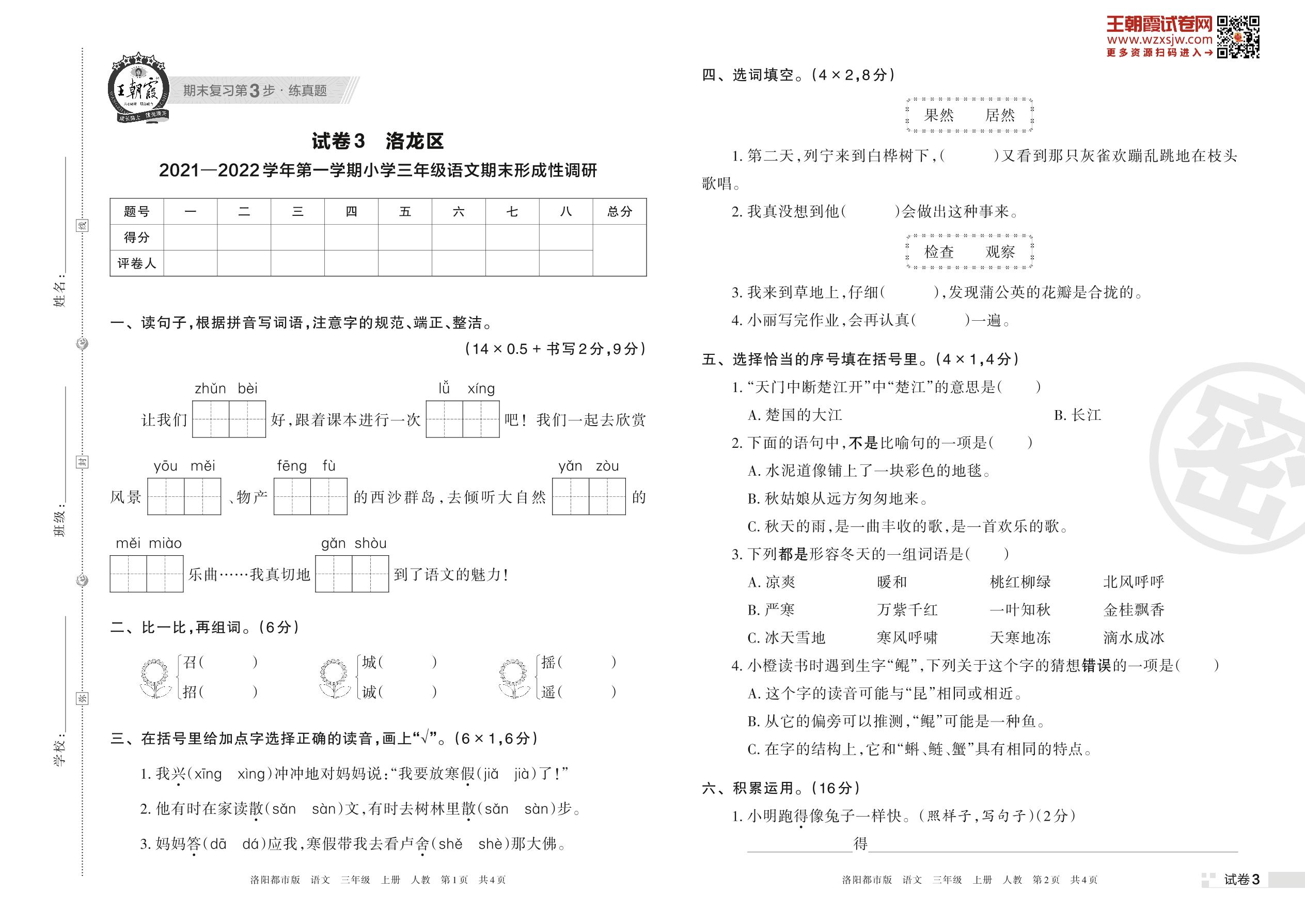 洛龙区2021—2022学年第一学期小学三年级语文期末形成性调研(人教版)【3】