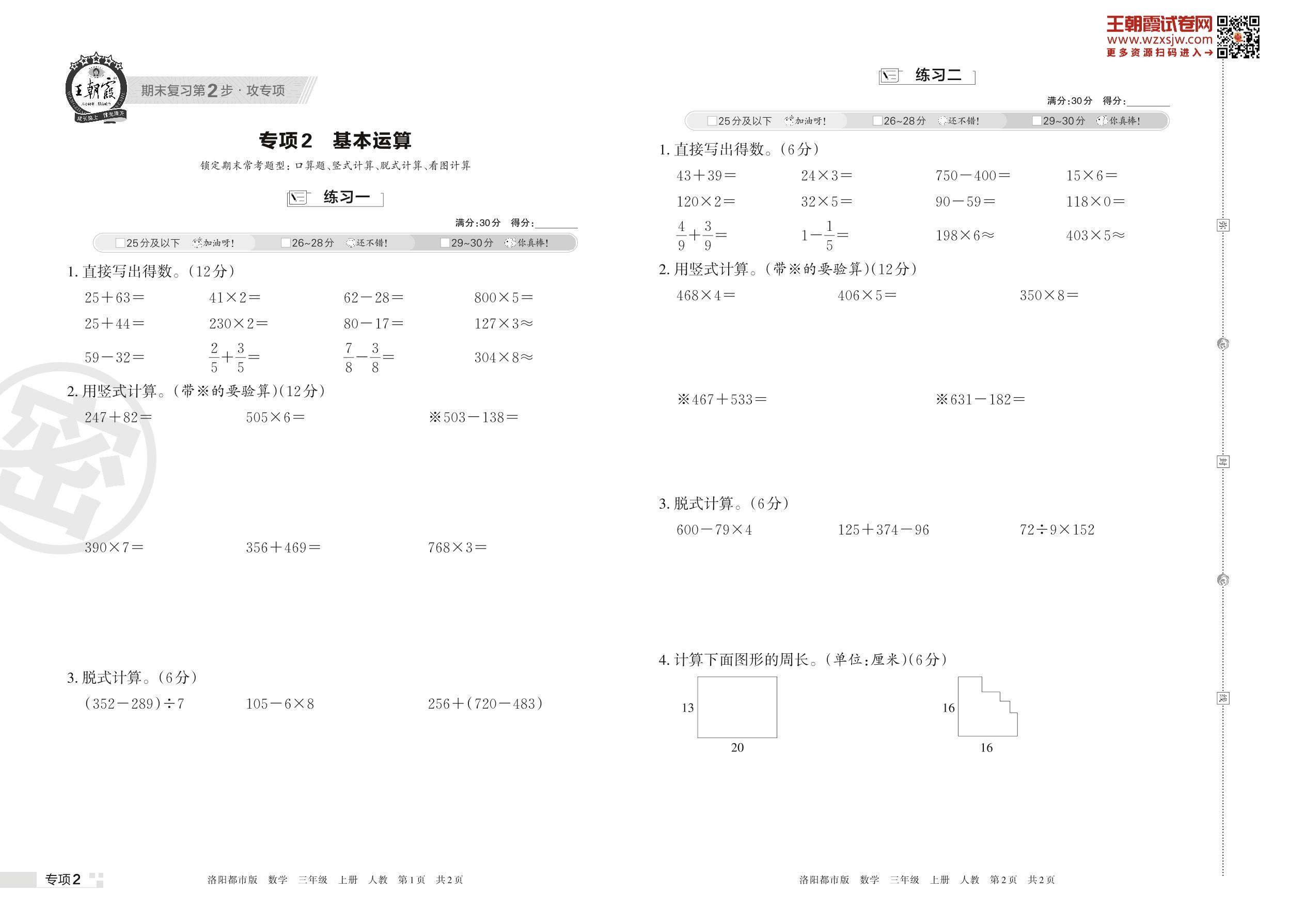 王朝霞期末专项卷——基本运算三年级上册数学(人教版)_R221112164346301【2】