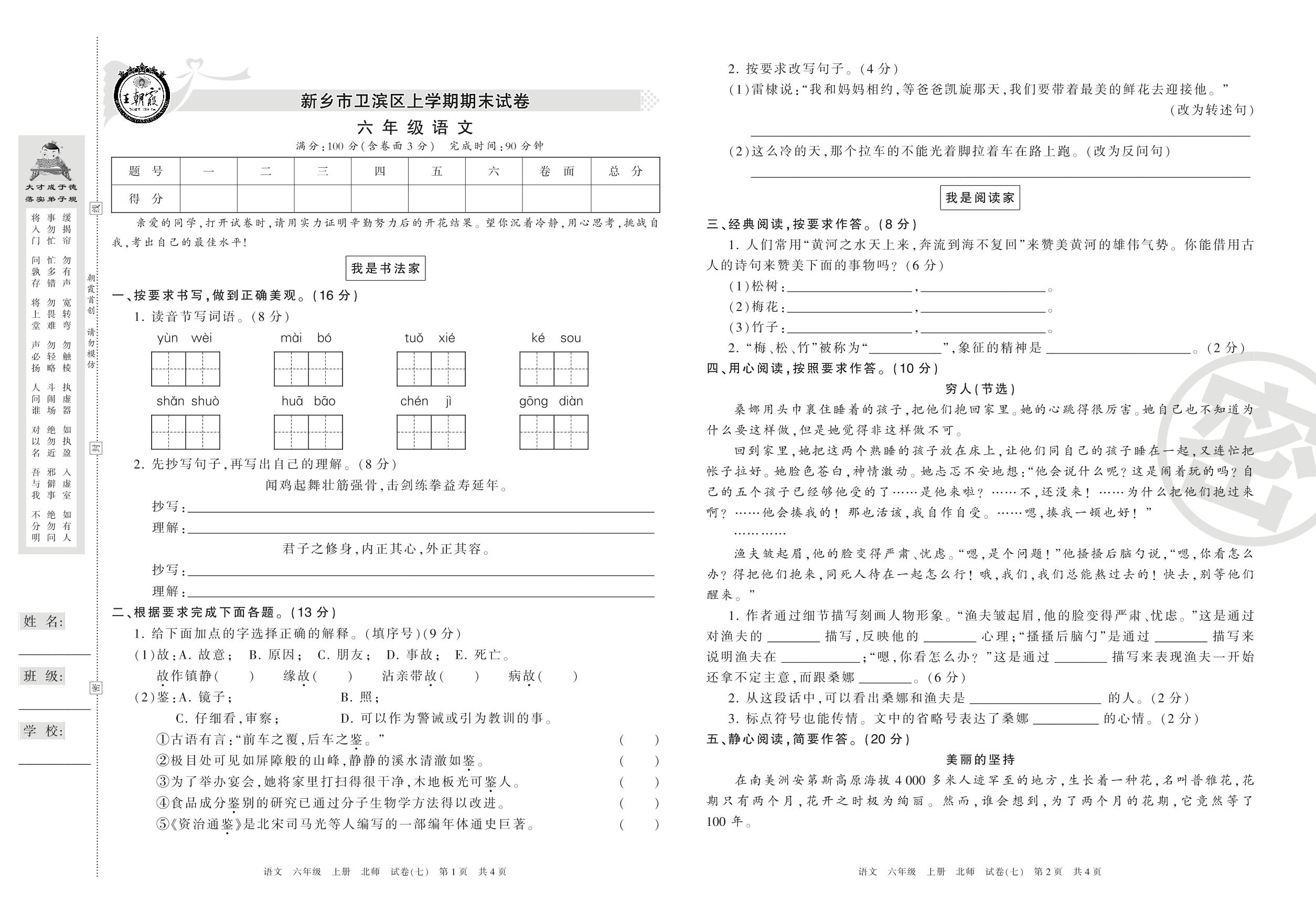 2016-2017学年第一学期新乡市卫滨区六年级语文试卷(北师版)【7】