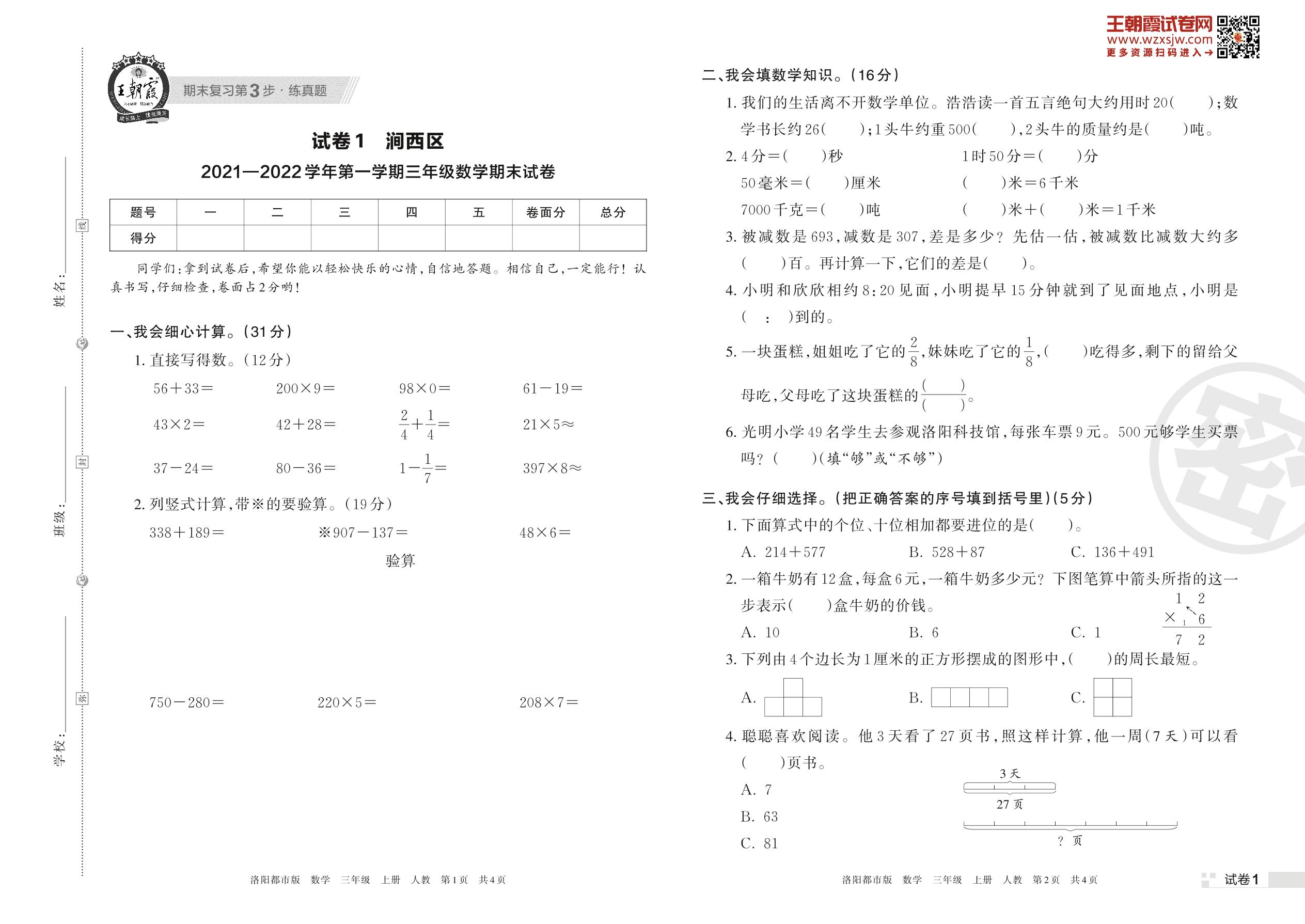 涧西区2021—2022学年第一学期三年级数学期末试卷(人教版)【1】
