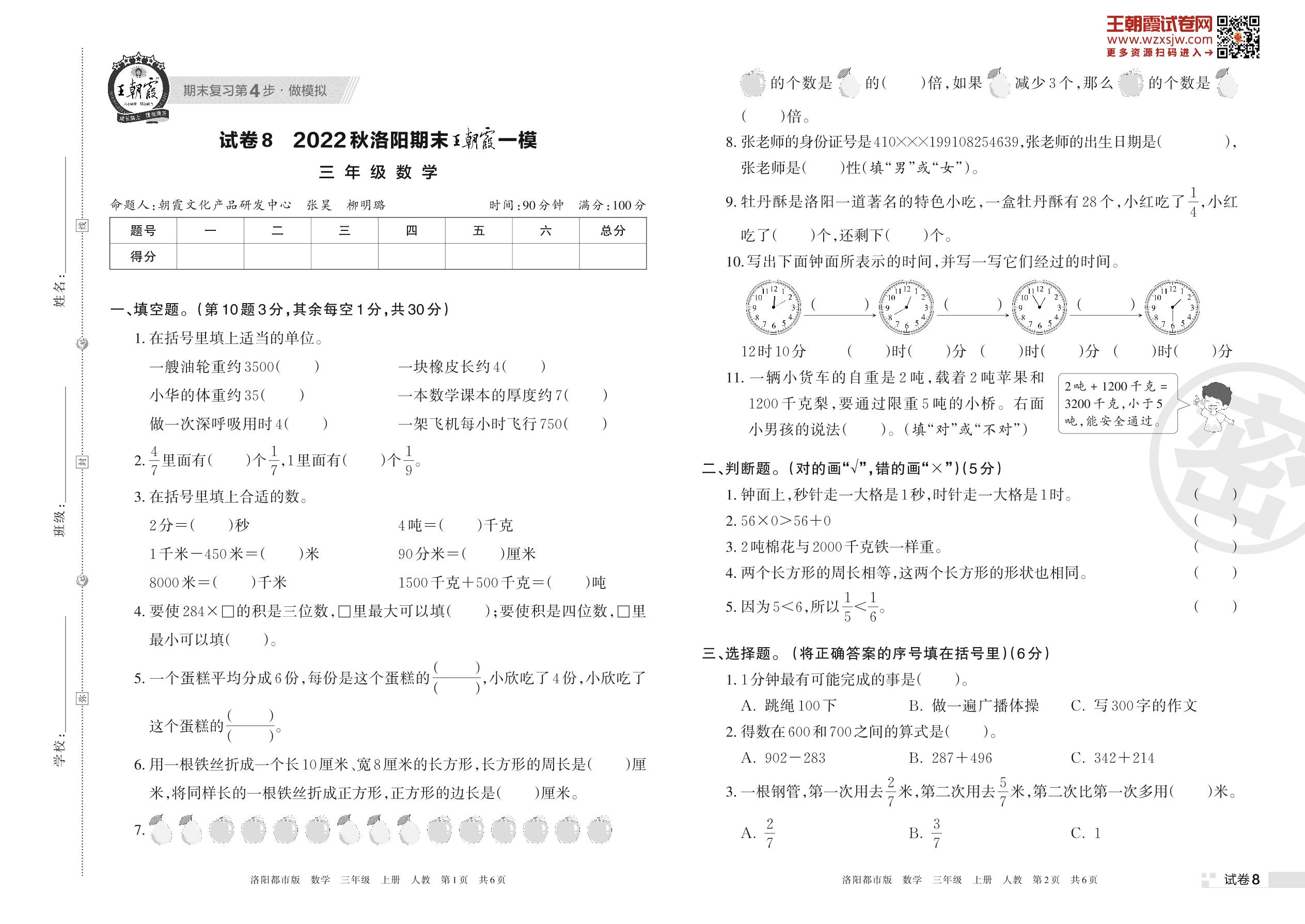 王朝霞期末模拟卷三年级上册数学(人教版)_R221112164348766【8】