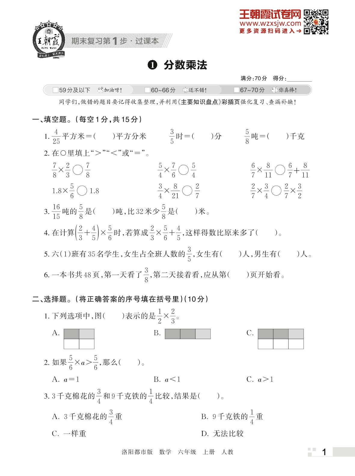 王朝霞期末过课本——1 分数乘法六年级上册数学(人教版)_R221112165334047