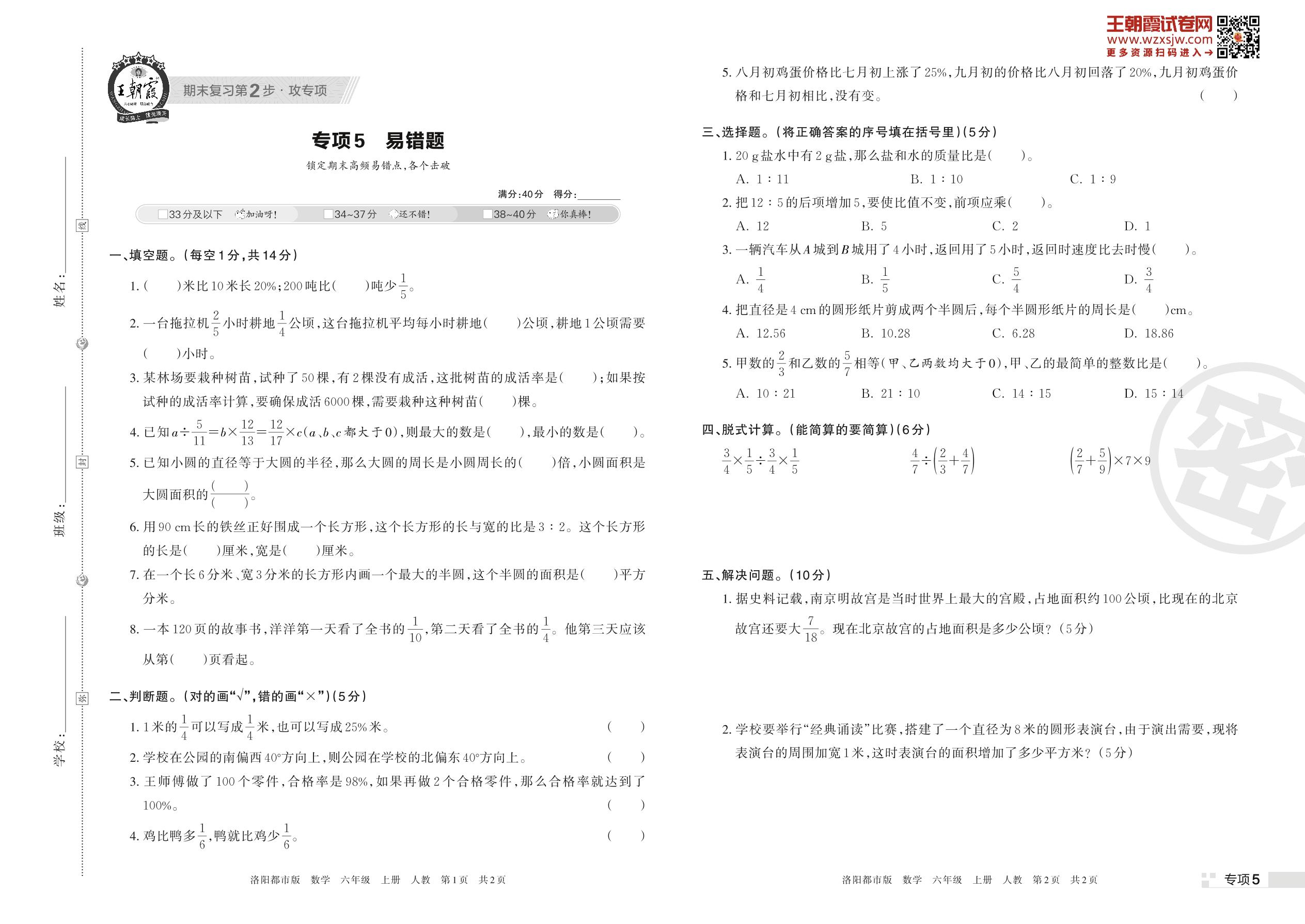 王朝霞期末专项卷——易错题六年级上册数学(人教版)_R221112165335269【5】