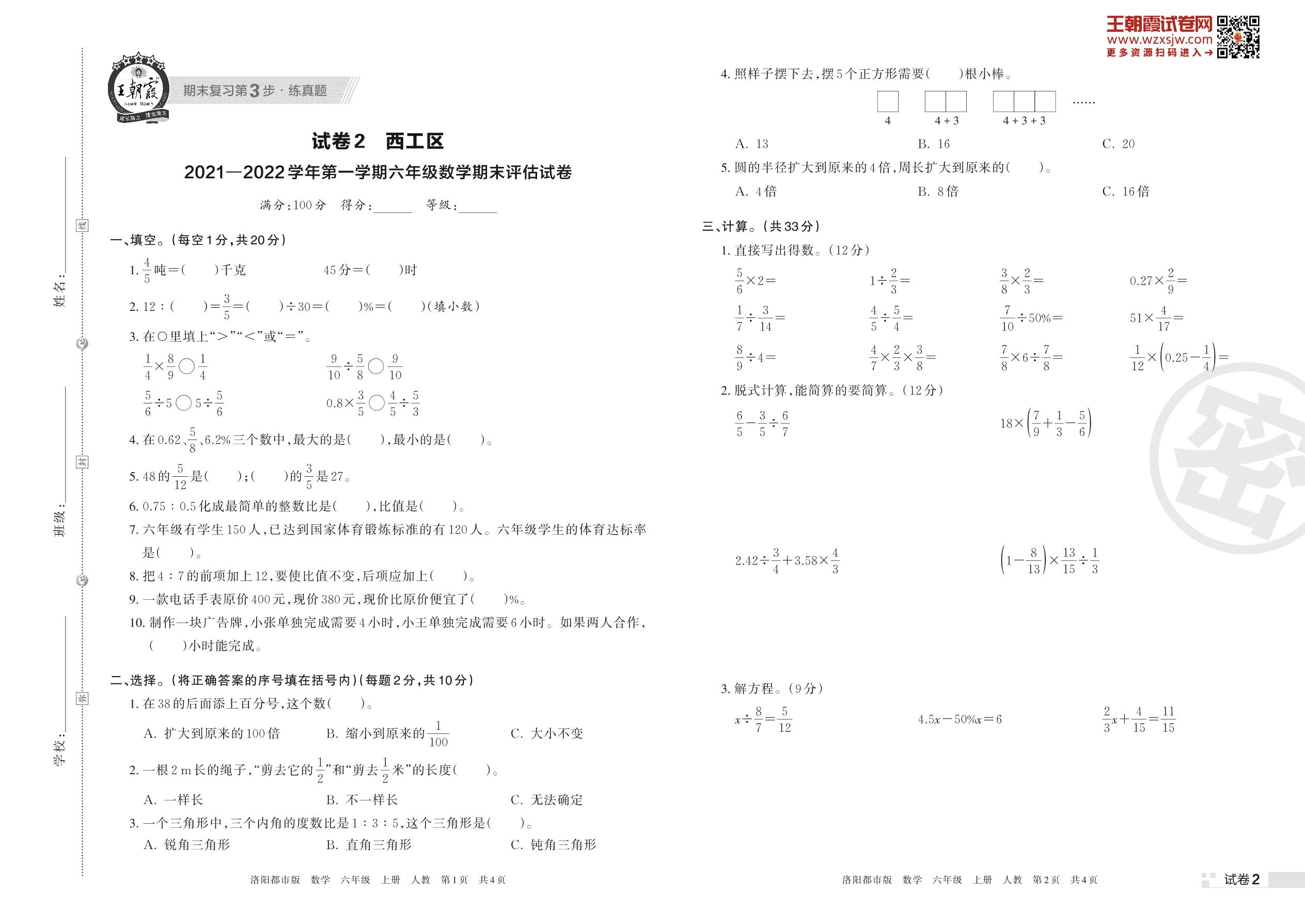 西工区2021—2022学年第一学期六年级数学期末评估试卷(人教版)【2】