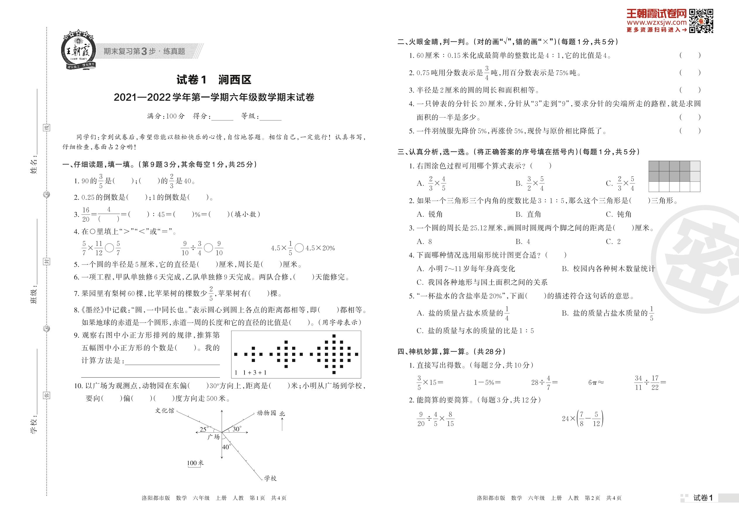 涧西区2021—2022学年第一学期六年级数学期末试卷(人教版)【1】