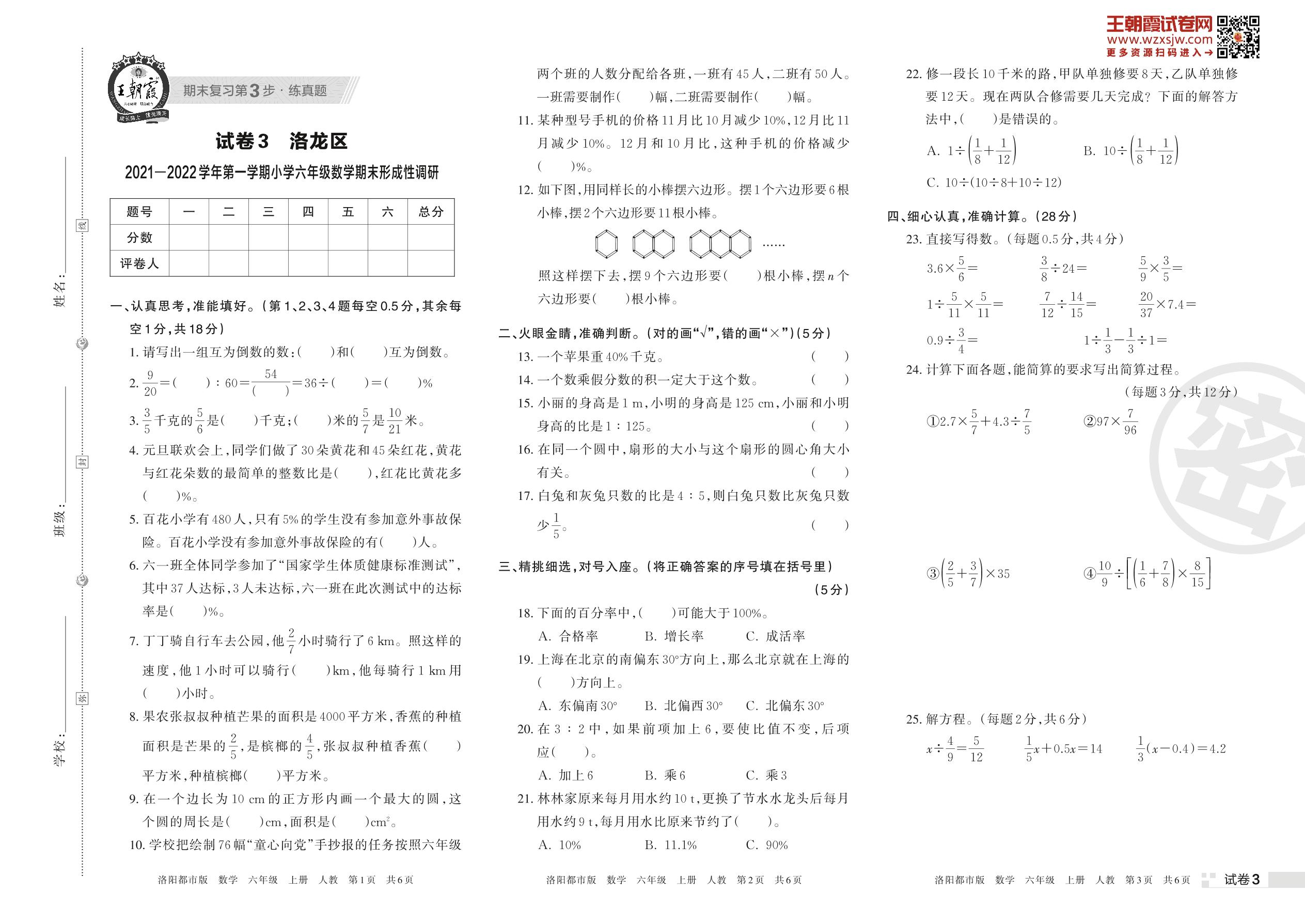 洛龙区2021—2022学年第一学期小学六年级数学期末形成性调研(人教版)【3】