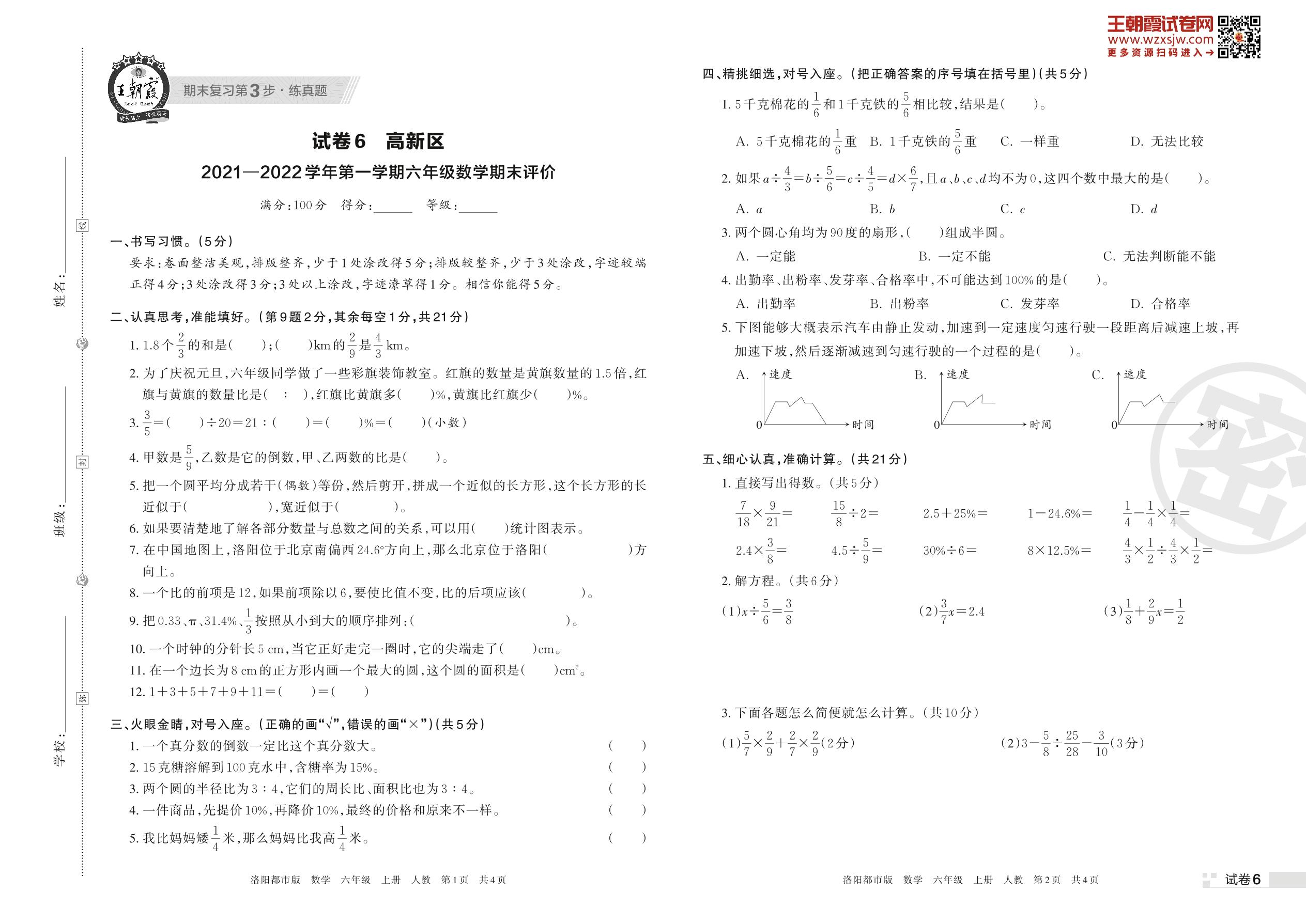 高新区2021—2022学年第一学期六年级数学期末评价(人教版)【6】