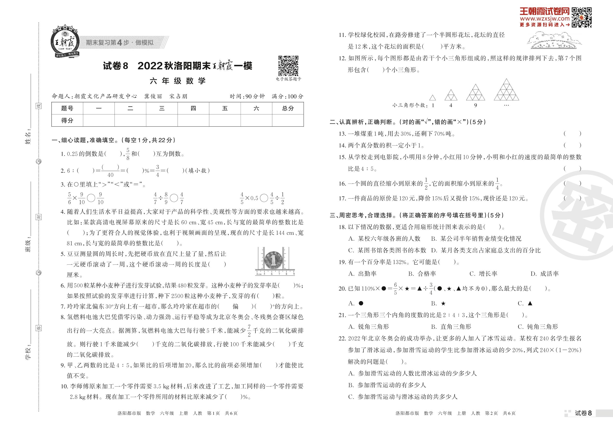 王朝霞期末模拟卷六年级上册数学(人教版)_R221112165336001【8】