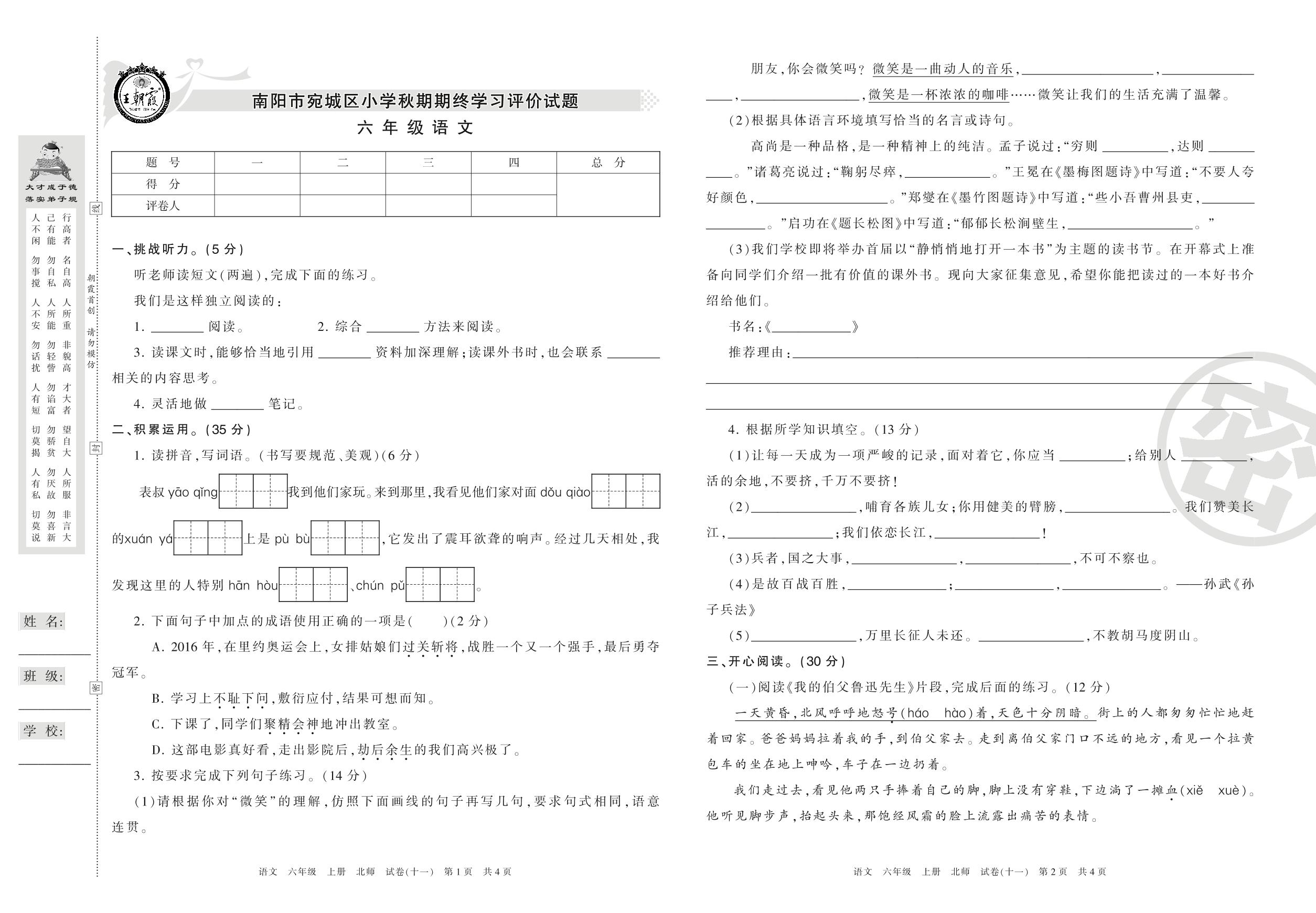 2016-2017学年第一学期南阳市宛城区六年级语文试卷(北师版)【11】