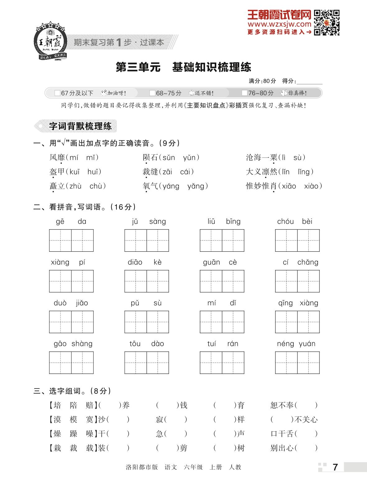 王朝霞期末过课本——第三单元 基础知识梳理练六年级上册语文(人教版)_R221112170034260