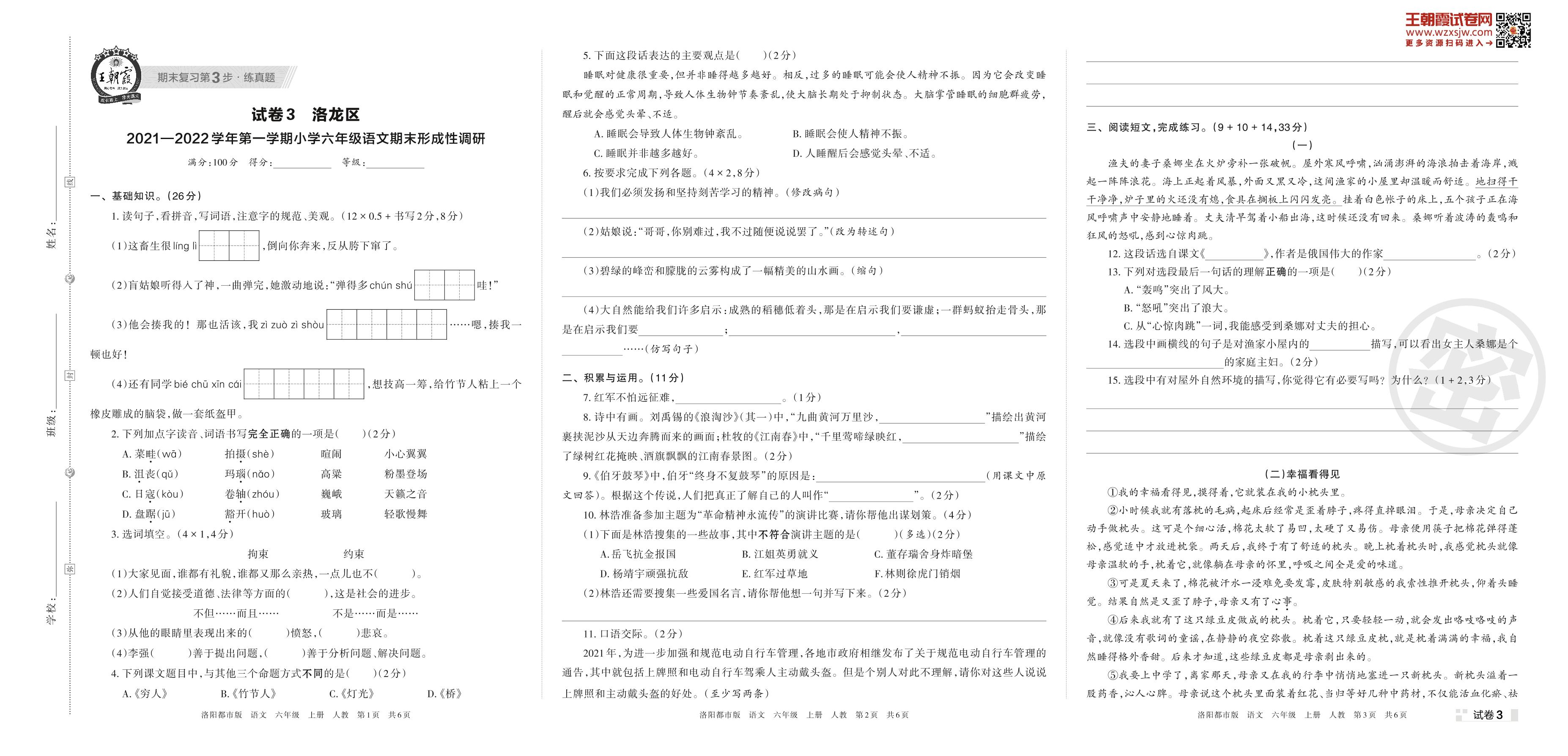 洛龙区2021—2022学年第一学期小学六年级语文期末形成性调研(人教版)【3】