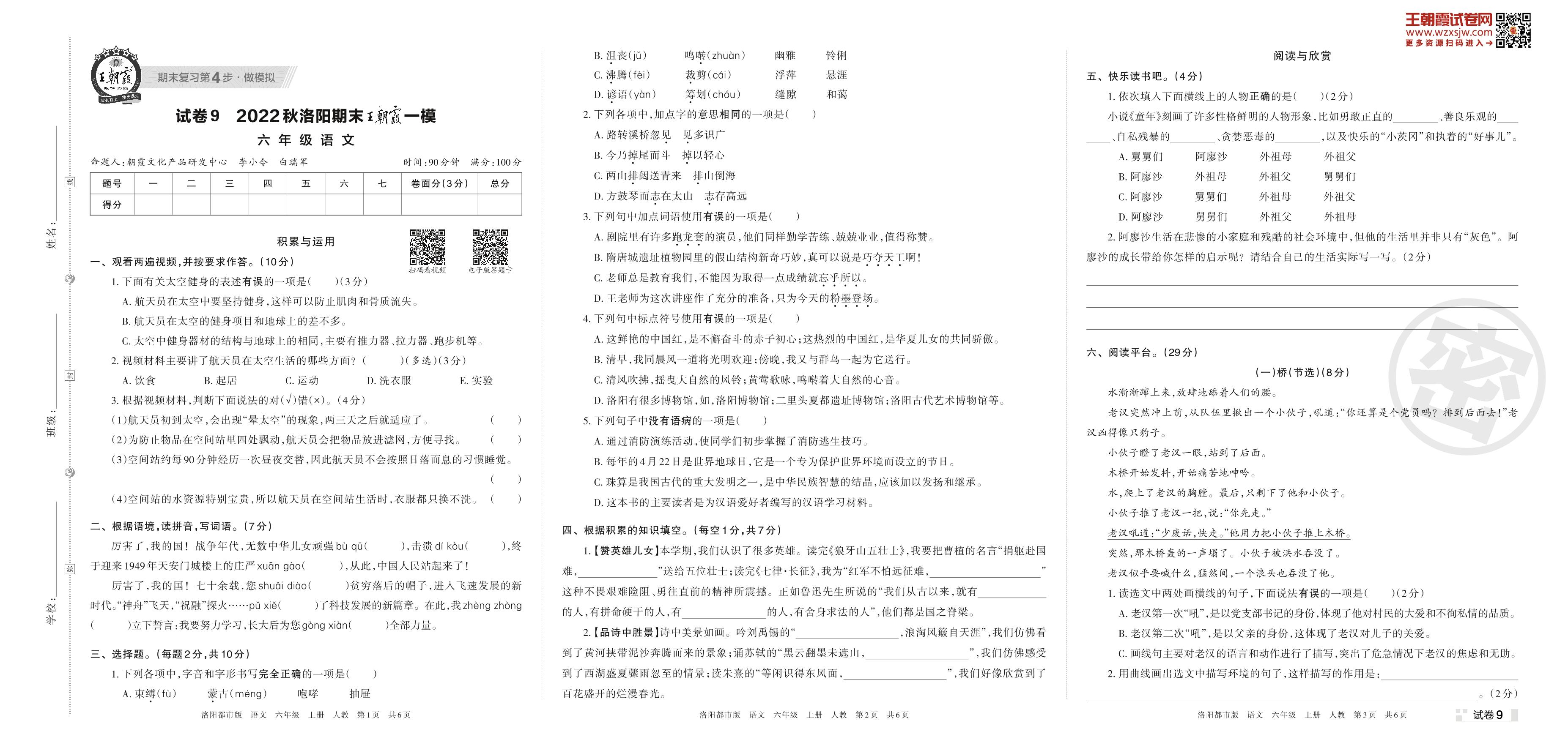 王朝霞期末模拟卷六年级上册语文(人教版)_R221112170037774【9】
