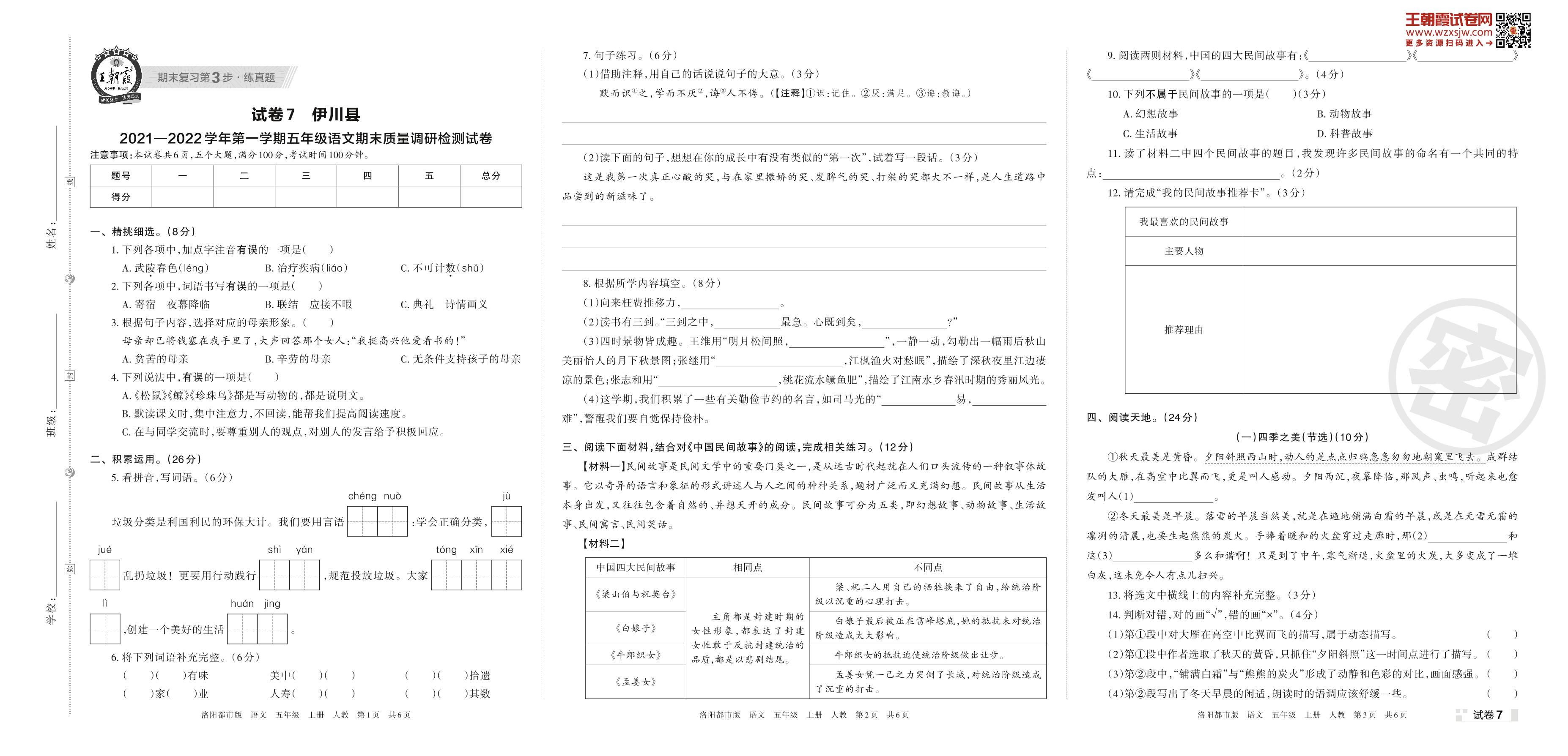 伊川县2021—2022学年第一学期五年级语文期末质量调研检测试卷(人教版)【7】