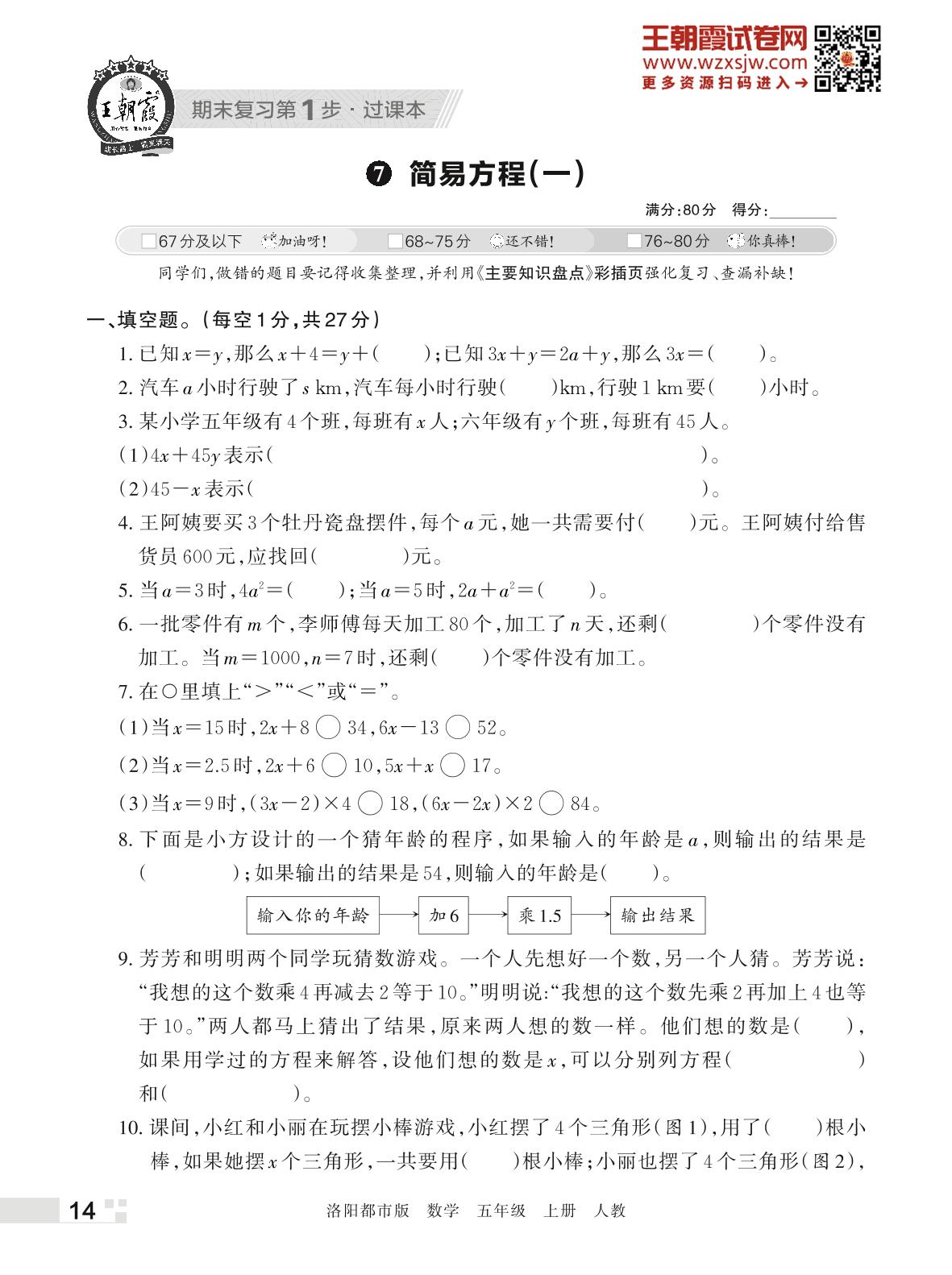 王朝霞期末过课本——7 简易方程(一)五年级上册数学(人教版)_R221112173137960
