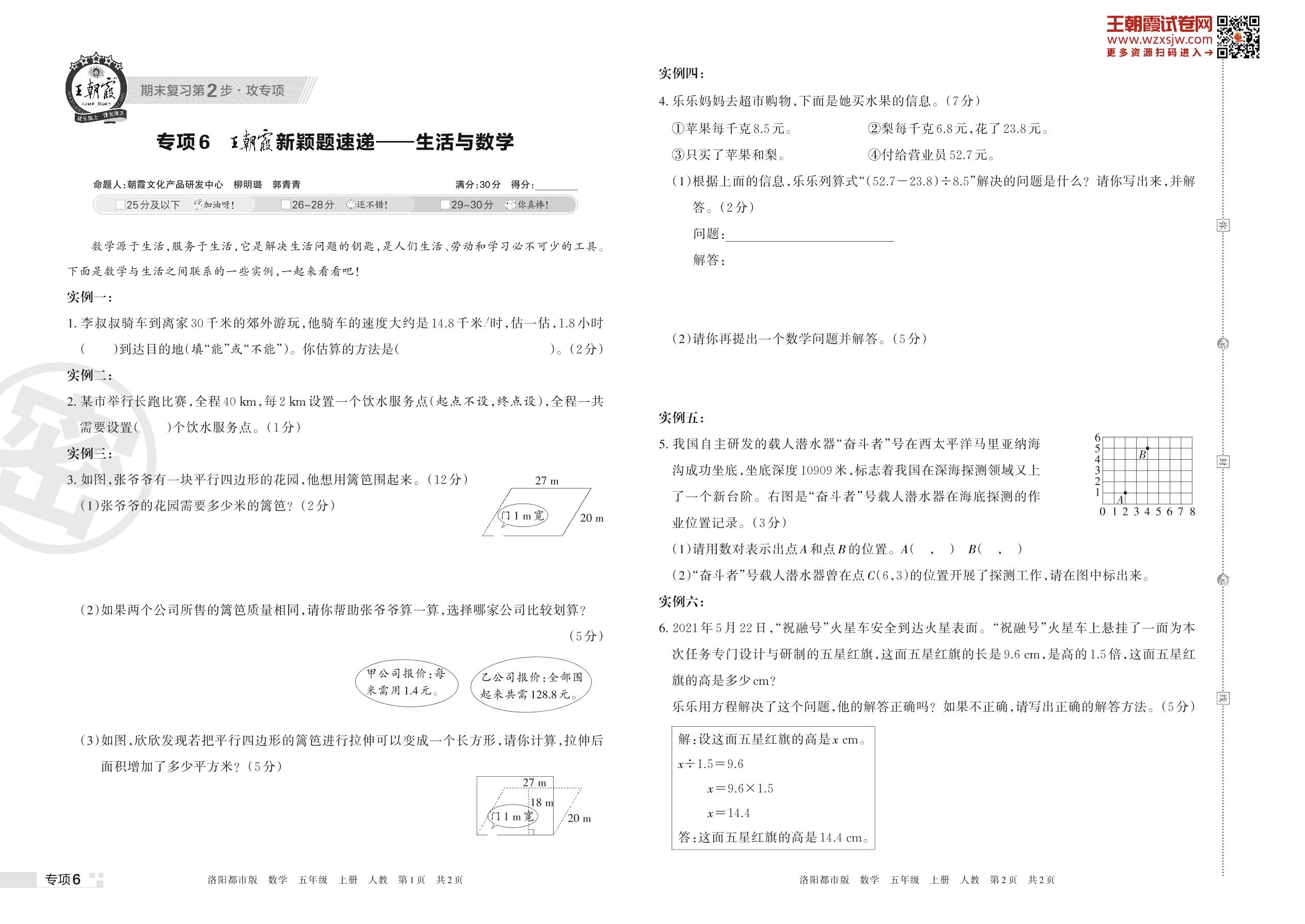 王朝霞期末专项卷——王朝霞新颖题速递:生活与数学五年级上册数学(人教版)_R221112173139805【6】