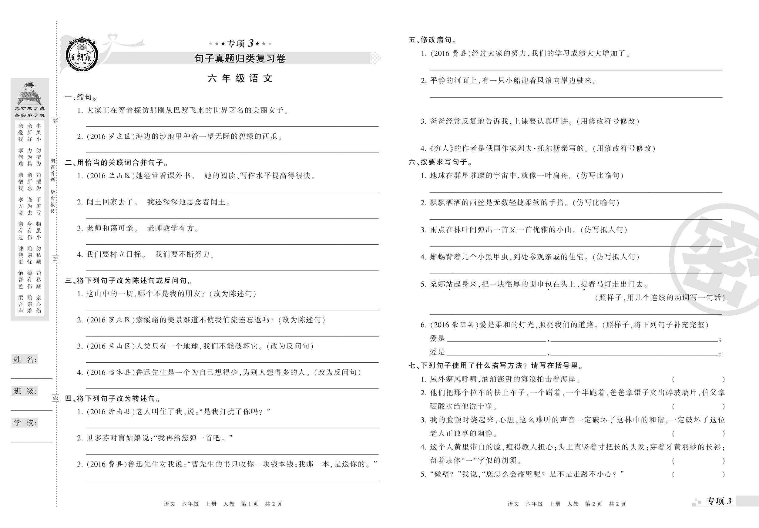 王朝霞期末专项卷——句子、课文内容真题归类复习卷六年级上册语文(人教版)_R210802113811【0】