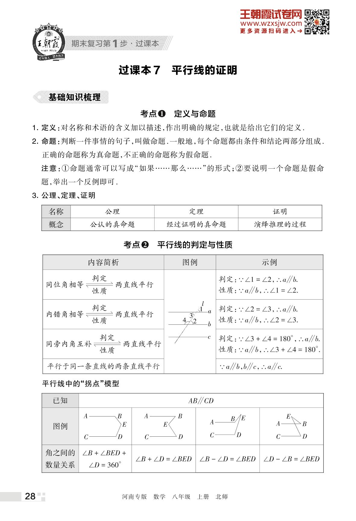 王朝霞期末过课本——7 平行线的证明八年级上册数学(北师版)