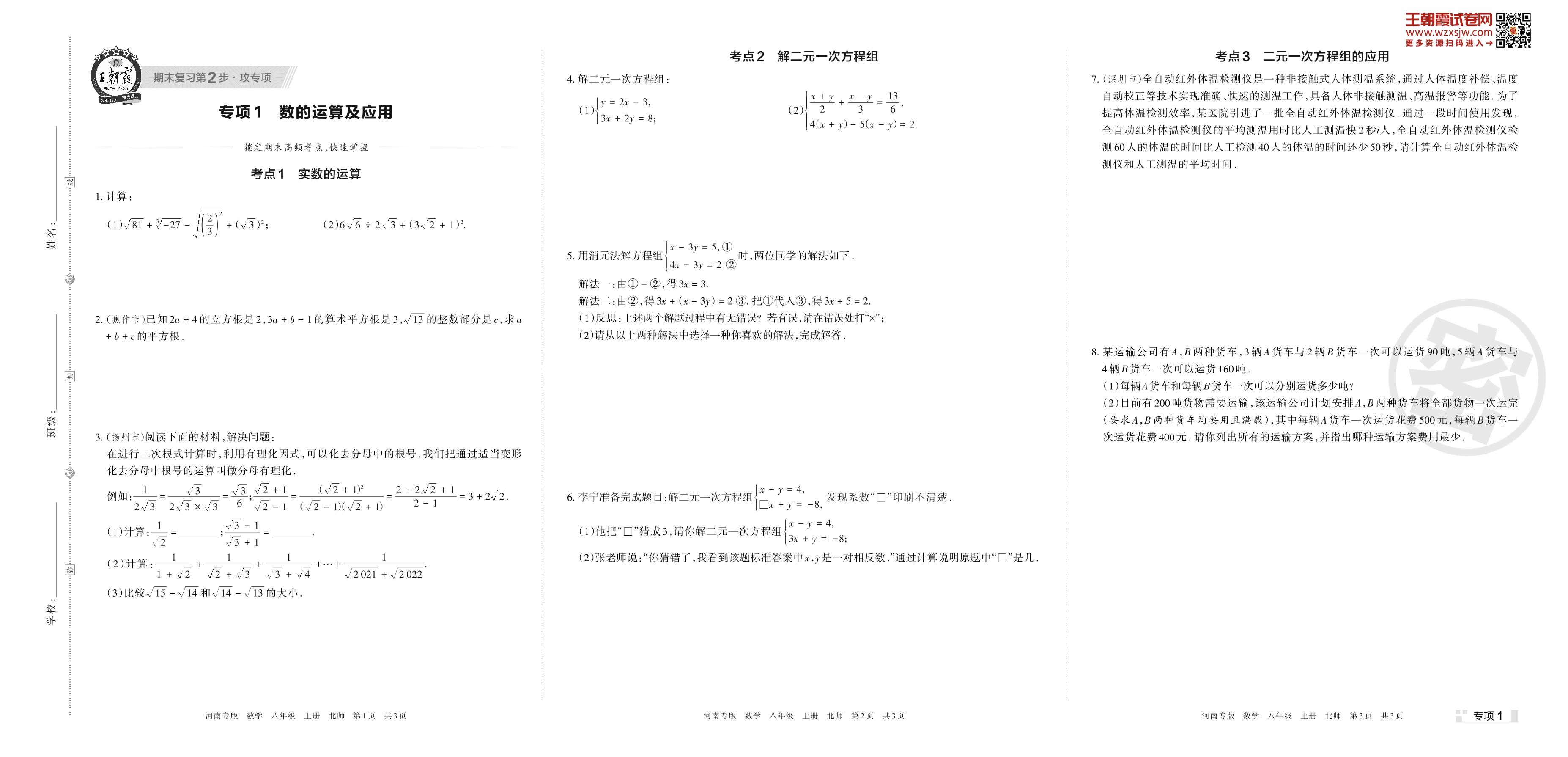 王朝霞期末专项卷——数的运算及运用八年级上册数学(北师版)【1】