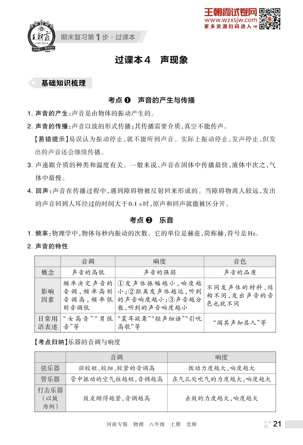 王朝霞期末过课本——4 声现象八年级上册物理(北师版)