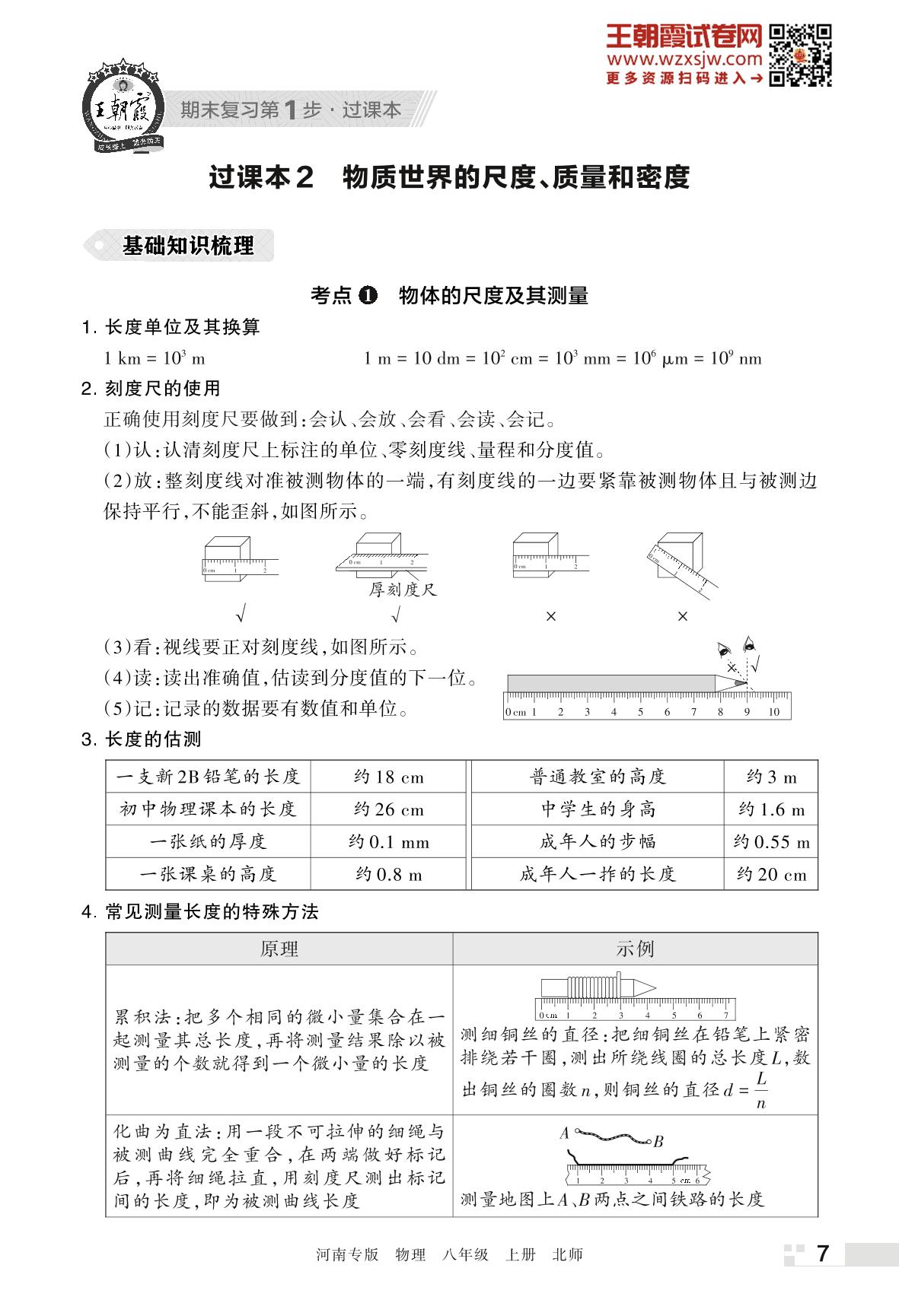 王朝霞期末过课本——2 物质世界的尺度、质量和密度八年级上册物理(北师版)
